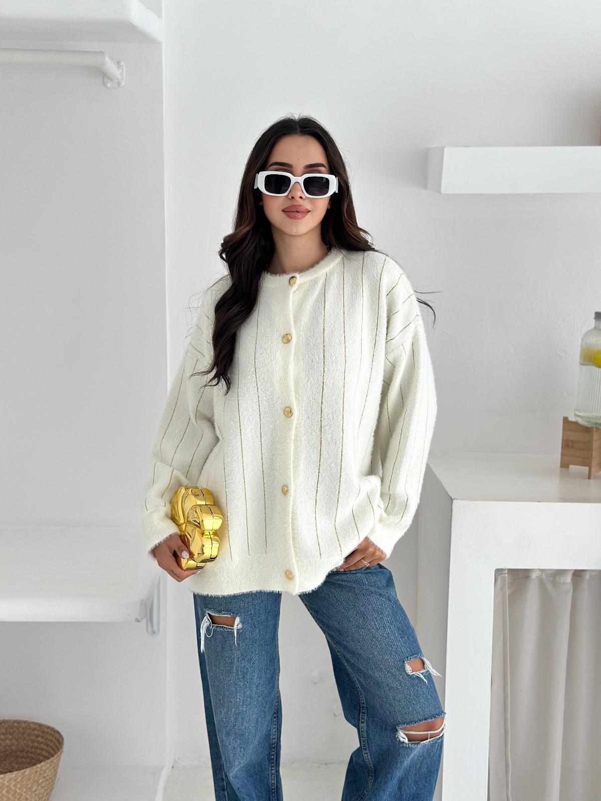 Yumuşacık dokusu ve zarif çizgili deseniyle öne çıkan bu düğmeli triko hırka, konforlu ve şık bir görünüm sunar.