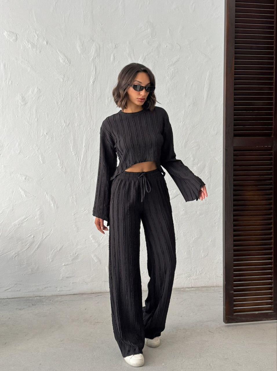 Günlük şıklığı ve rahatlığı bir arada sunan fitilli kumaş salaş ikili takım, crop top ve geniş paça pantolondan oluşuyor. Yumuşak dokulu fitilli kumaşı sayesinde gün boyu konfor sağlarken, modern ve salaş kesimiyle spor-şık kombinler için ideal. Belden ayarlanabilir ip detayı ile her bedene uyum sağlar.
