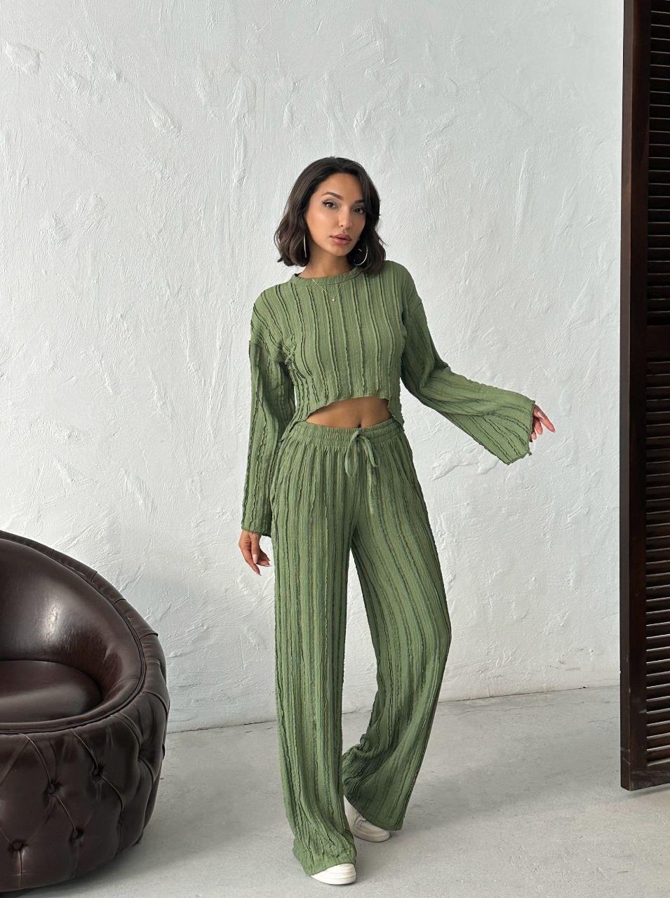 Günlük şıklığı ve rahatlığı bir arada sunan fitilli kumaş salaş ikili takım, crop top ve geniş paça pantolondan oluşuyor. Yumuşak dokulu fitilli kumaşı sayesinde gün boyu konfor sağlarken, modern ve salaş kesimiyle spor-şık kombinler için ideal. Belden ayarlanabilir ip detayı ile her bedene uyum sağlar.