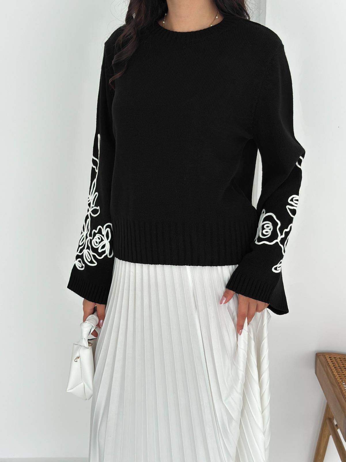Feminen ve zarif detaylarıyla öne çıkan kolları nakış detaylı İspanyol kol triko kazak, sade şıklığı sevenler için ideal bir seçimdir.