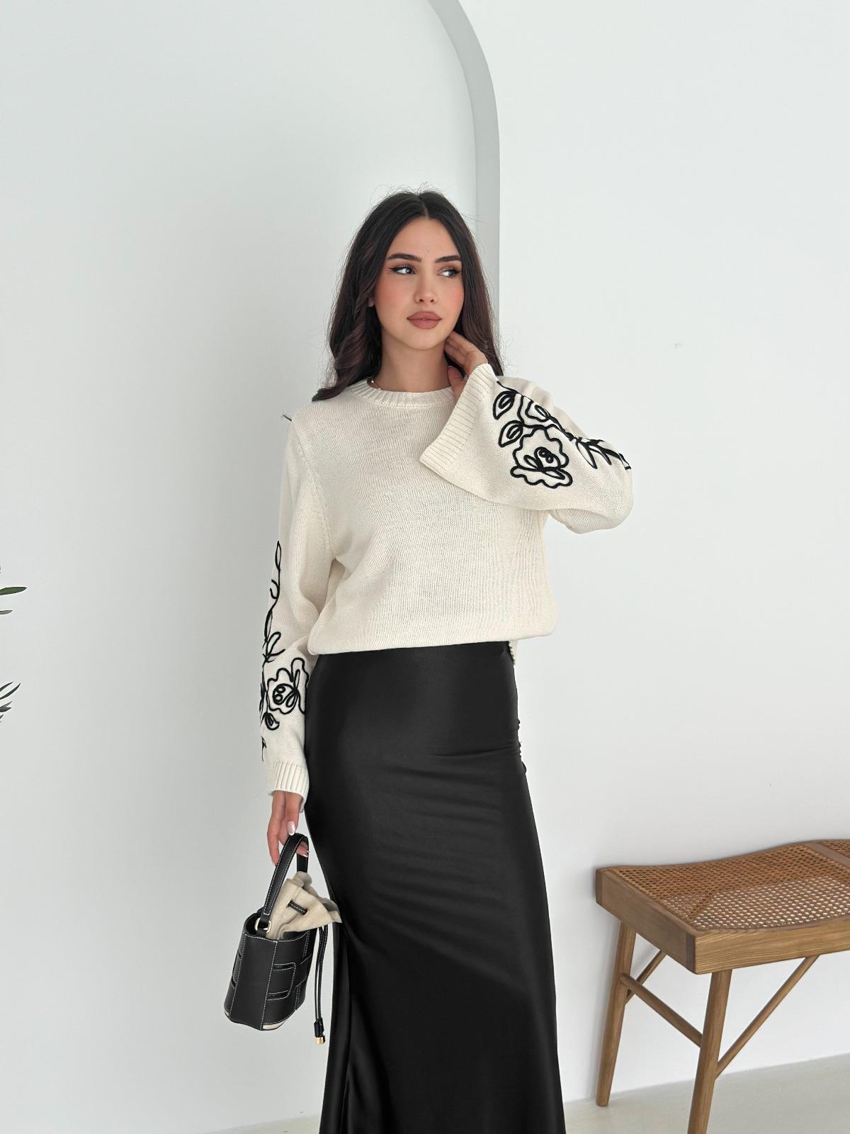Feminen ve zarif detaylarıyla öne çıkan kolları nakış detaylı İspanyol kol triko kazak, sade şıklığı sevenler için ideal bir seçimdir.
