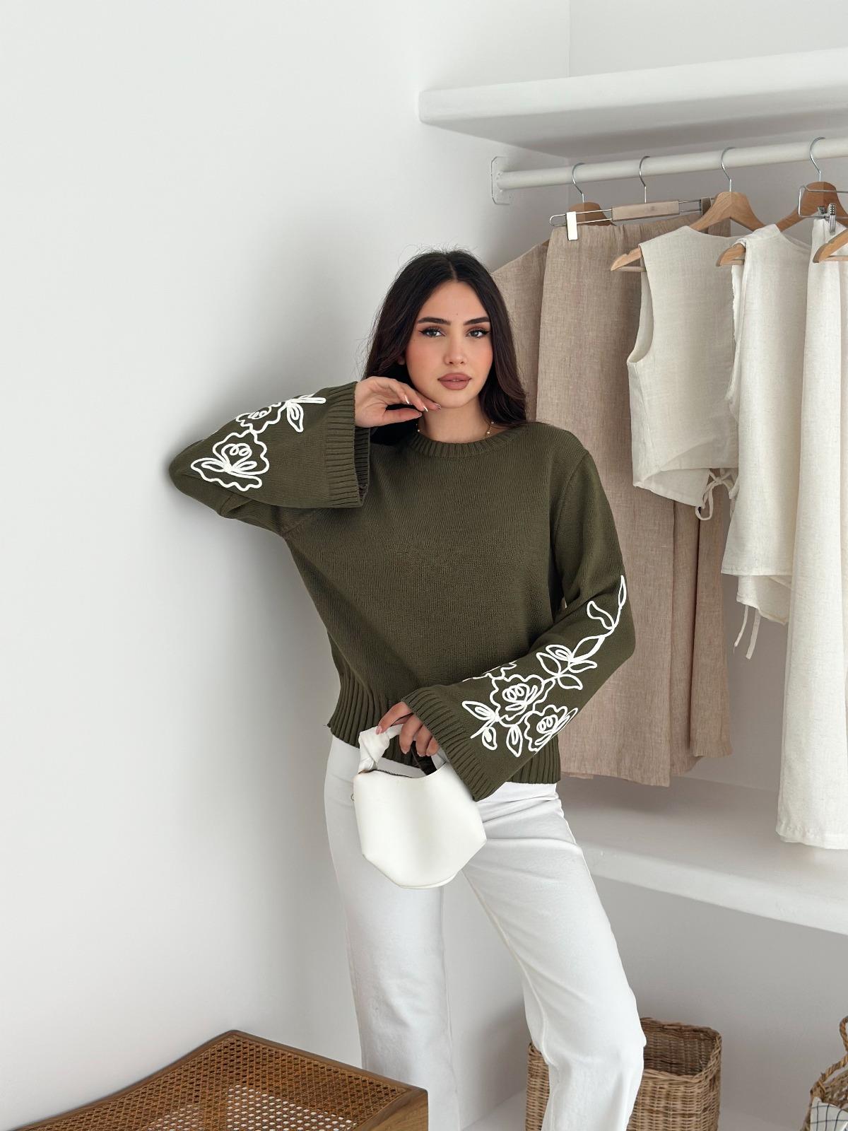 Feminen ve zarif detaylarıyla öne çıkan kolları nakış detaylı İspanyol kol triko kazak, sade şıklığı sevenler için ideal bir seçimdir.