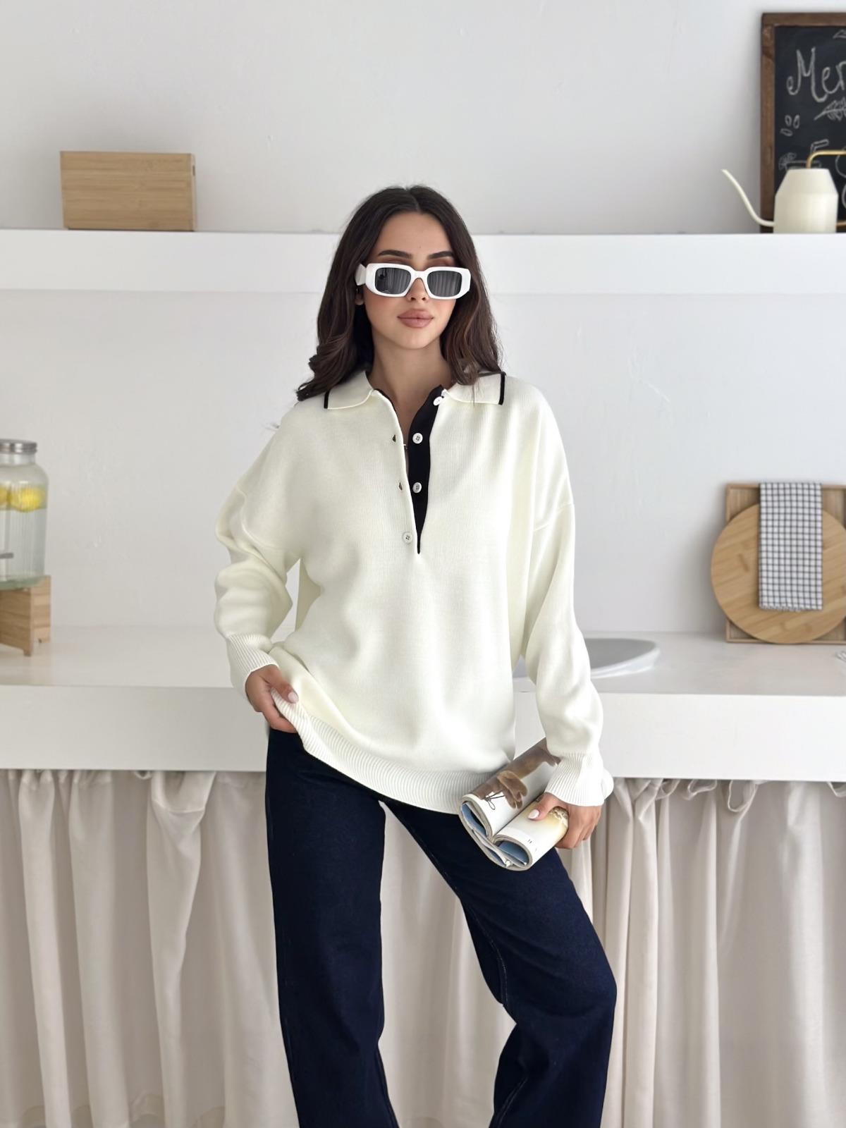 Kontrast Detaylı Polo Yaka Oversize Triko Kazak (2531)