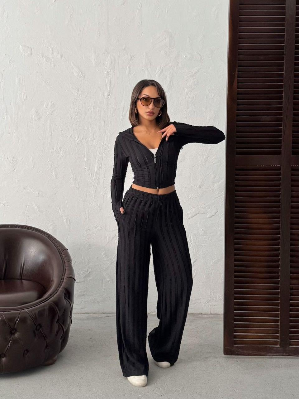 Dikey dokulu, esnek örme kumaştan iki parçalı takım. Parmak geçme detaylı fermuarlı kapüşonlu crop üst ve yüksek bel geniş paça pantolondan oluşur. Günlük ve şehir stiline uygun konforlu kalıp.
