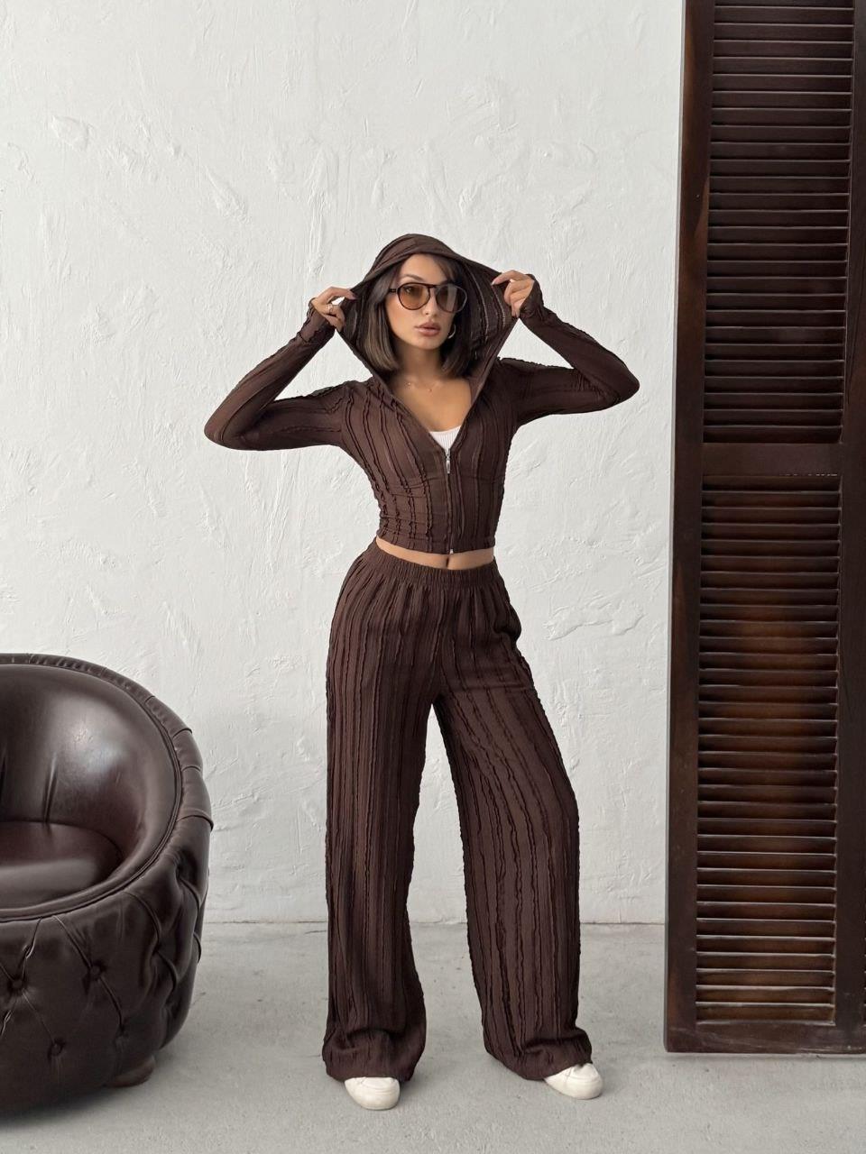 Dikey dokulu, esnek örme kumaştan iki parçalı takım. Parmak geçme detaylı fermuarlı kapüşonlu crop üst ve yüksek bel geniş paça pantolondan oluşur. Günlük ve şehir stiline uygun konforlu kalıp.