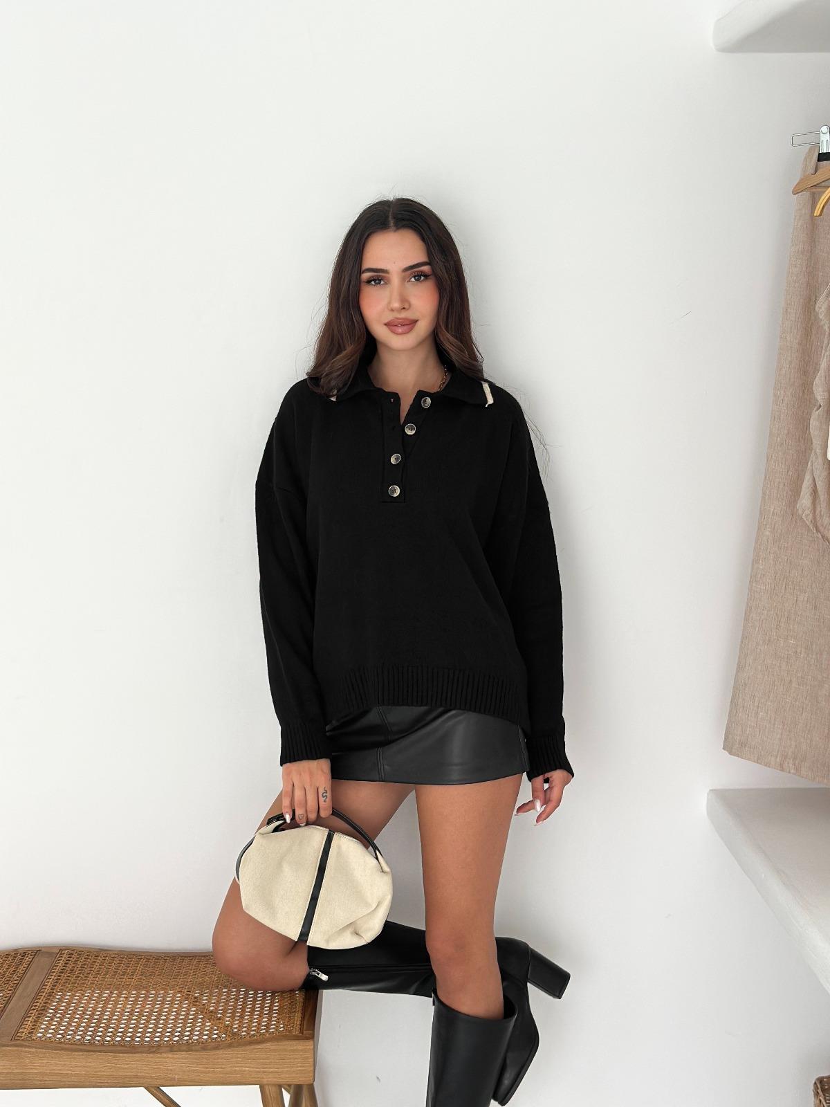 Klasik düğme detayı ve kontrast yaka hattı, kazağa modern bir dokunuş kazandırır.
