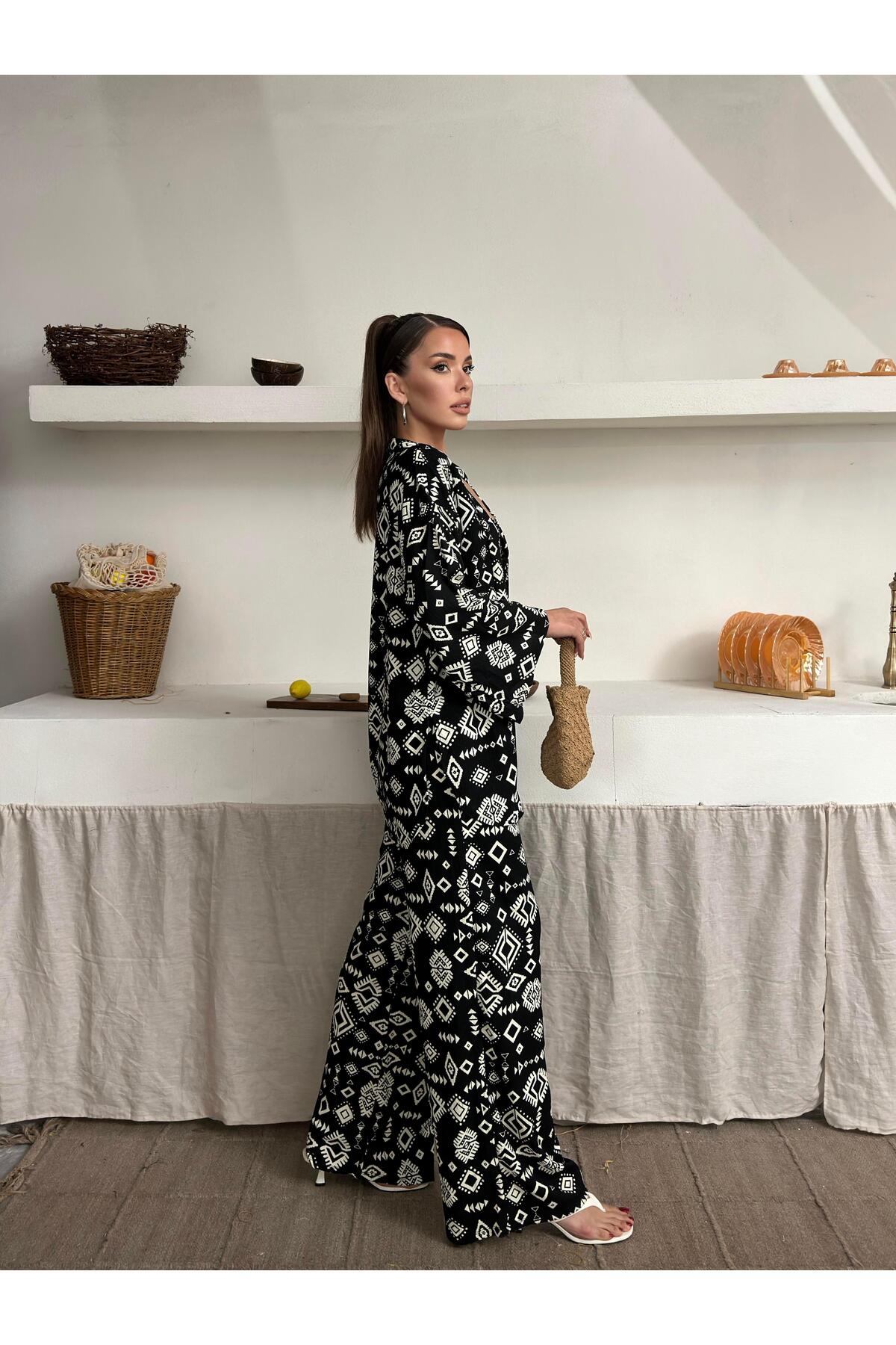 Rahatlık ve şıklığı bir arada sunan bürümcük kumaştan üretilmiş kimono üstü, gündüzden geceye her ortama uyum sağlar.; Ispanyol kol detayı ile modern ve zarif bir görünüm kazandırırken, oversize kesimi sayesinde gün boyu rahat hareket etme olanağı tanır.; Lastikli bel tasarımı sayesinde vücuda tam oturur ve konforlu bir kullanım sunar.; Regular boy kesimiyle tüm vücut tiplerine uyum sağlayarak şık bir siluet oluşturur.; Esnek kumaşı hareket özgürlüğünüzü kısıtlamaz; her türlü aktiviteye uygun esneklikte tasarlanmıştır.; Üç parça takım olarak gelen set, geometrik desenli pantolon ve kimono üstüyle tamamlanmış şık bir kombin sunar.;