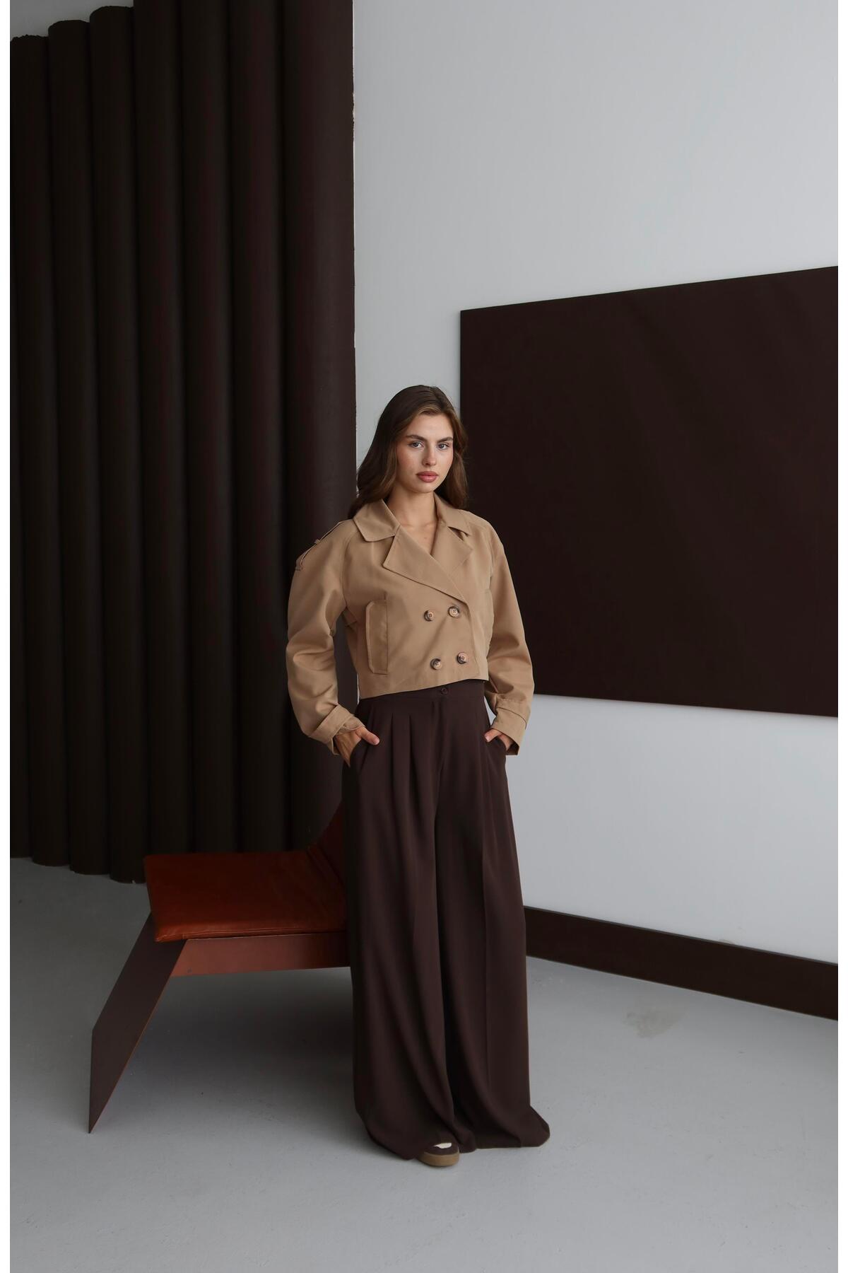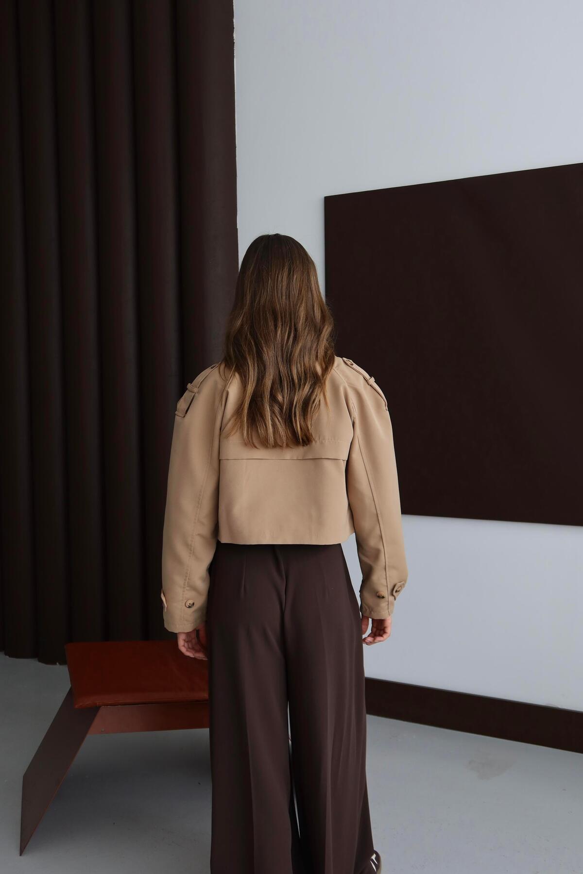 Bu crop trençkot, yüksek bel pantolonlar, etekler veya elbiselerle kombinlendiğinde stilinize modern bir dokunuş katar. Gardırobunuzda mutlaka yer alması gereken zamansız bir parça.