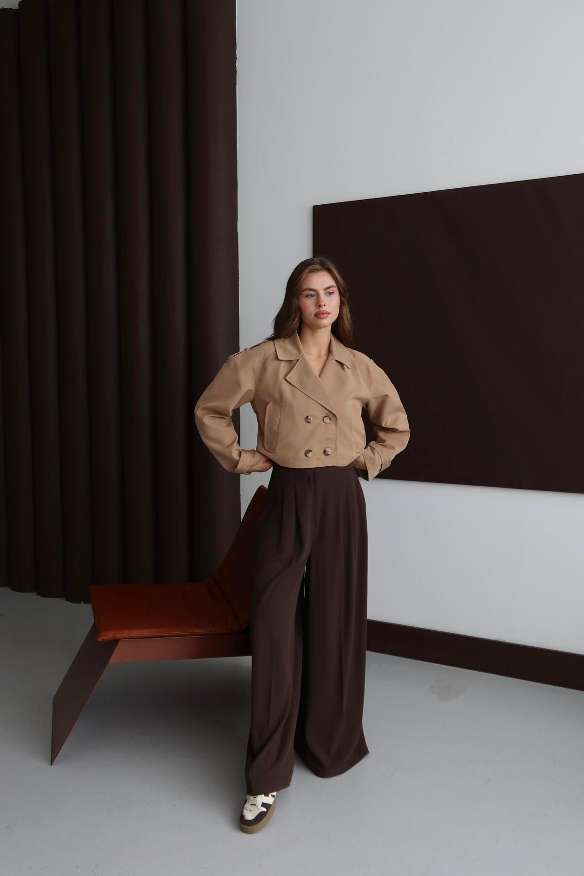 Yeni sezonun trend parçası olan kısa kruvaze crop trençkot, modern kesimi ve şık görünümüyle öne çıkıyor. Omuz detayları ve çift sıra düğmeli kruvaze tasarımı sayesinde klasik trençkot şıklığını crop formda sunar. Rahat kalıbı ile hem günlük kombinlerde hem de şık davetlerde kolayca kullanılabilir.