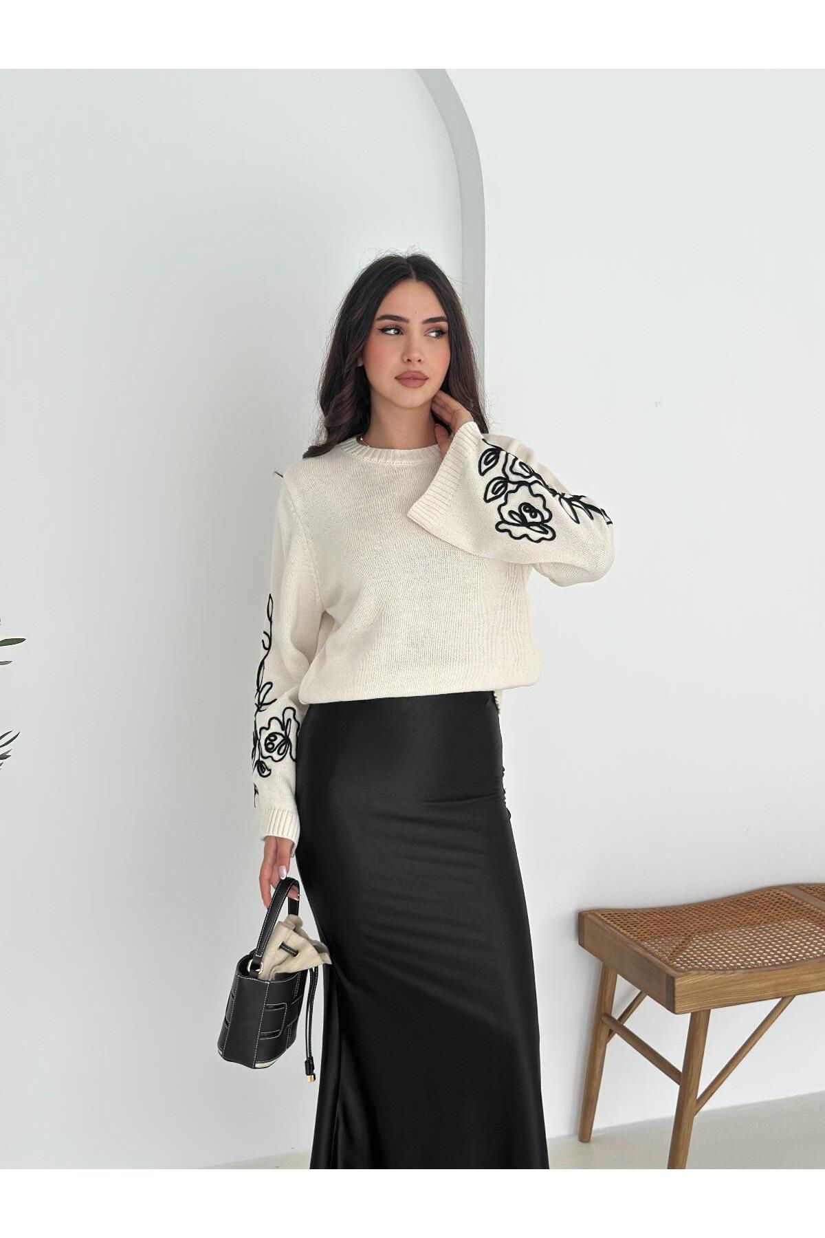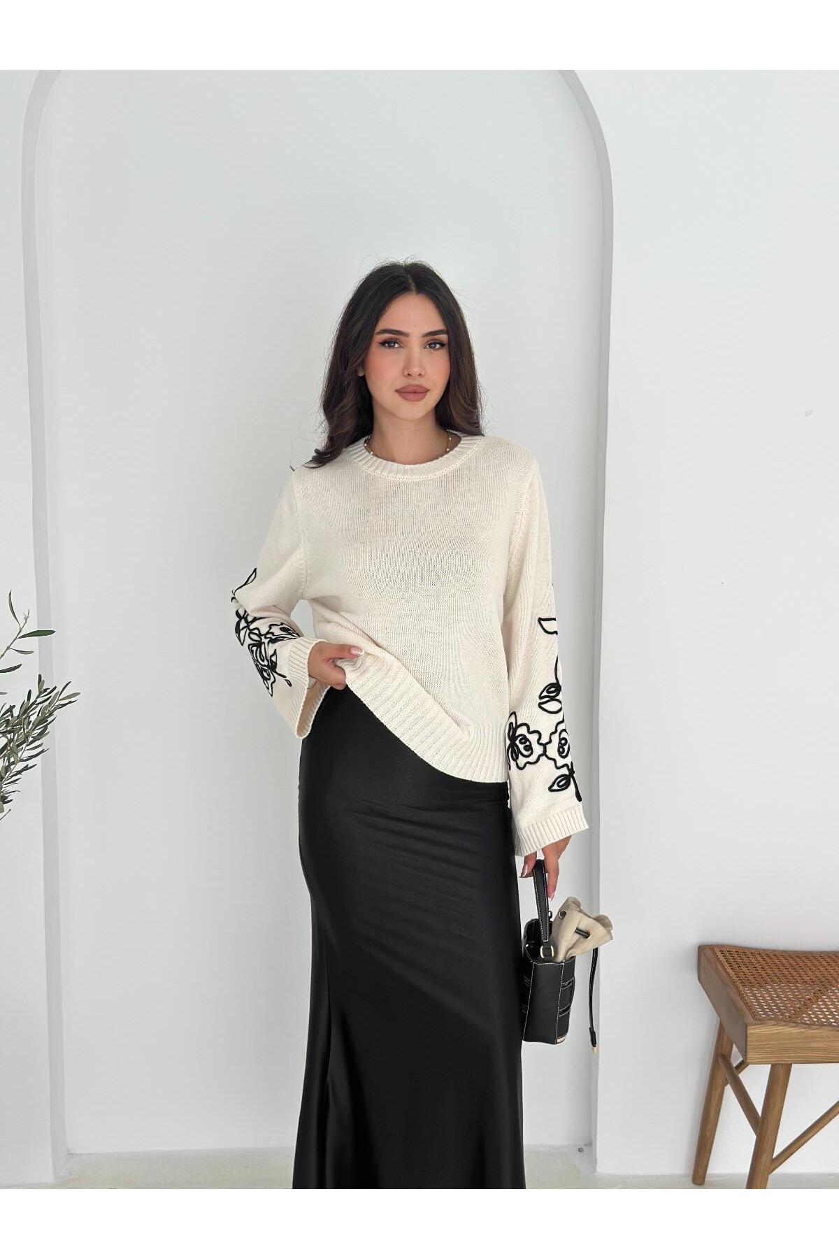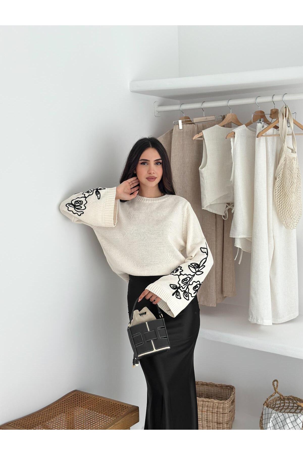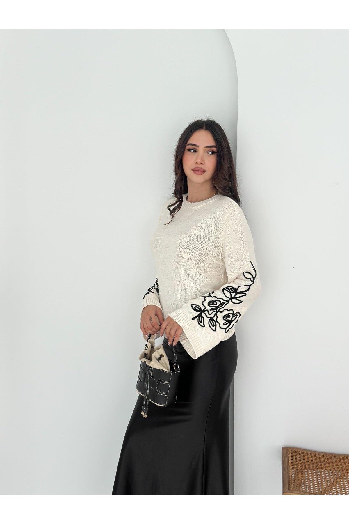 kolları nakış detaylı İspanyol kol triko kazak, sade şıklığı sevenler için ideal bir seçimdir.