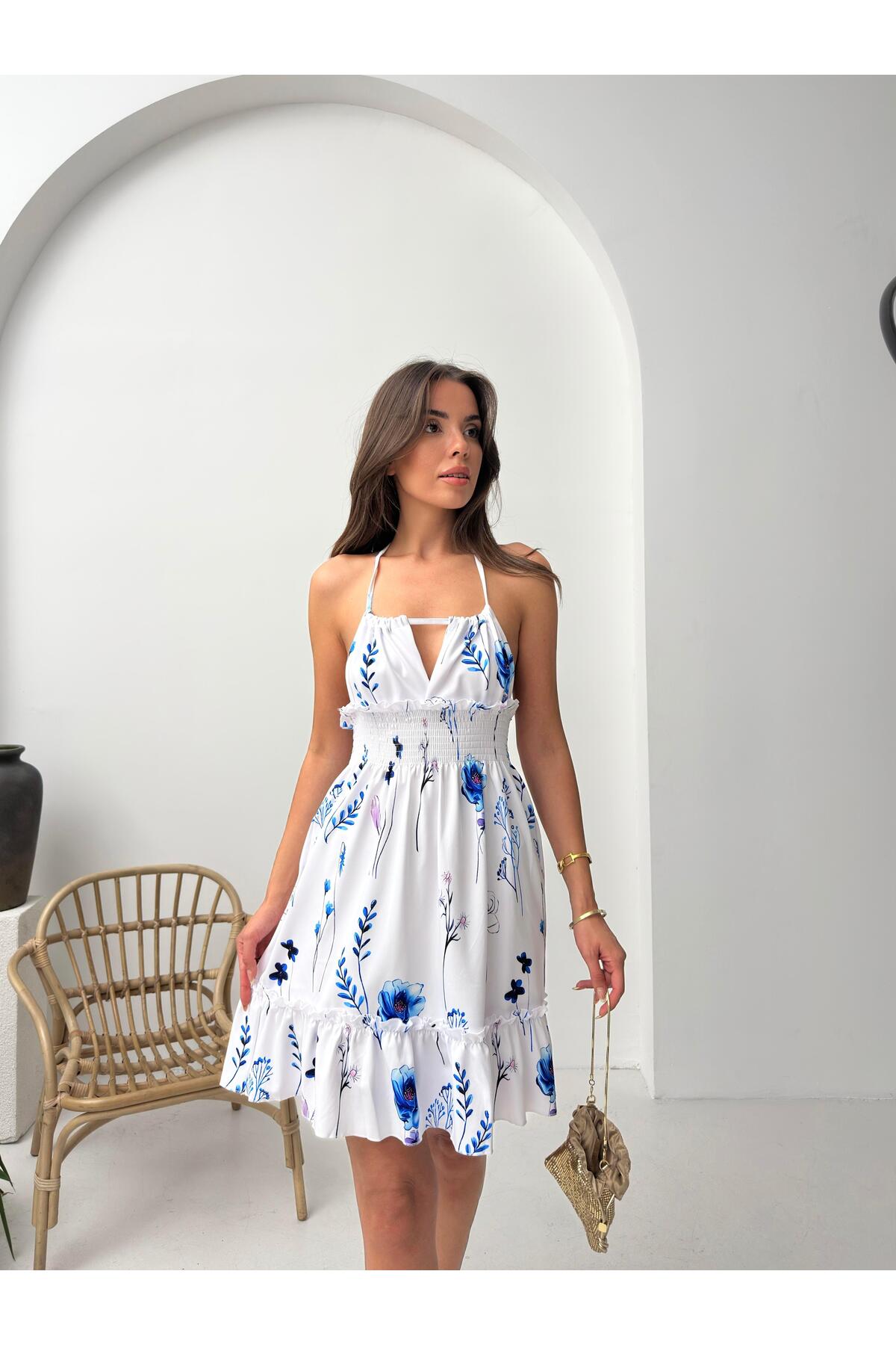Mavi Çiçek Desenli Halter Yaka Büzgülü Mini Elbise