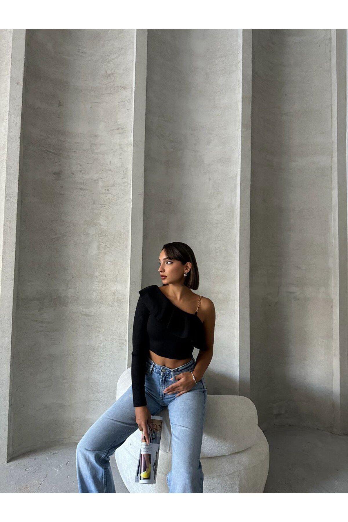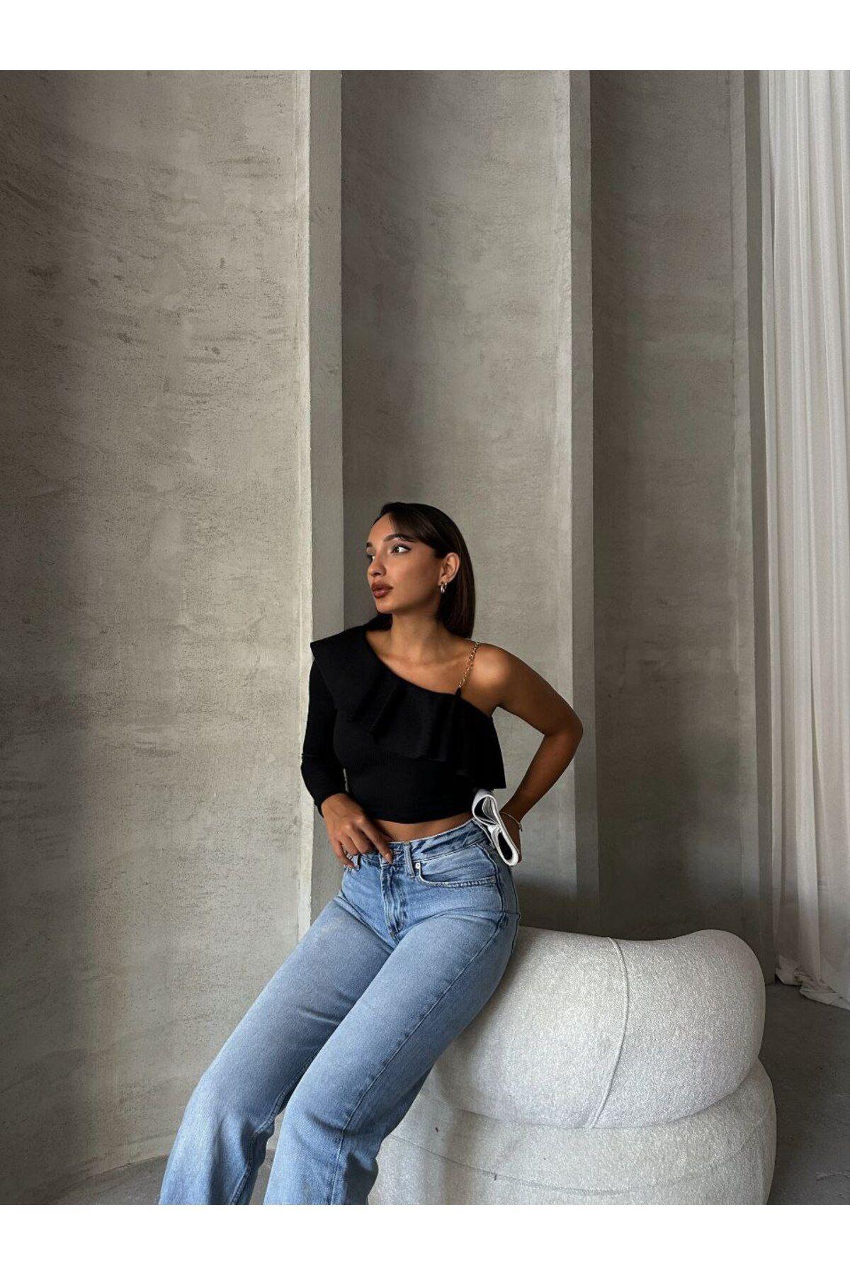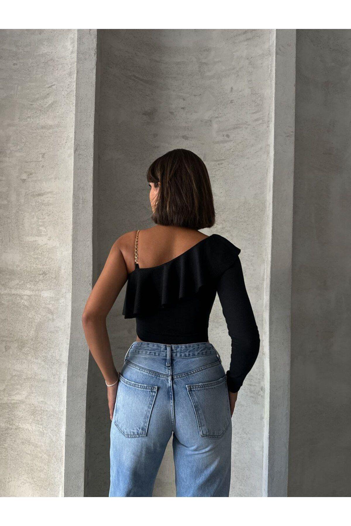 Önü Gipeli Tek Omuz Zincir Detaylı Uzun Kol Bürümcük Bluz