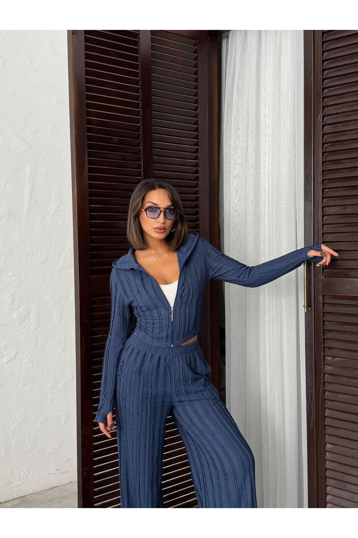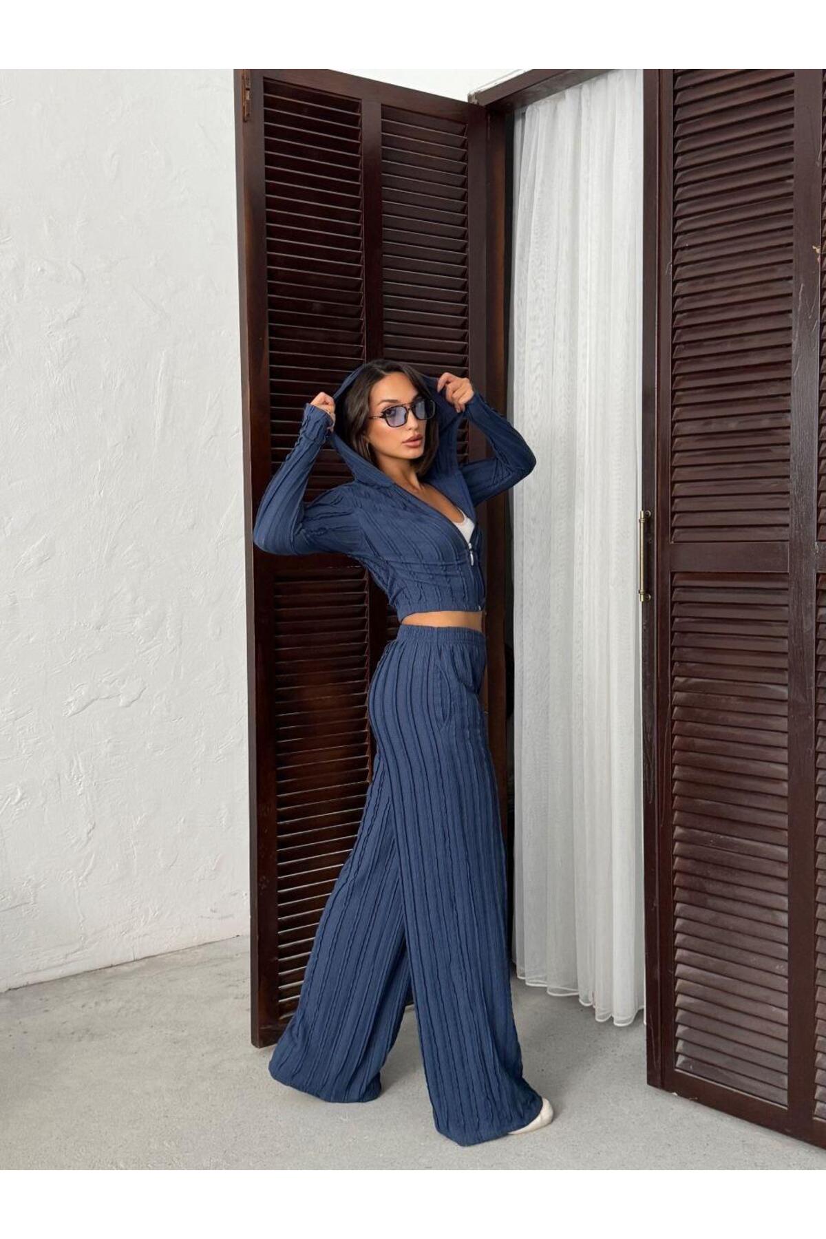 Parmak Geçmeli Kapüşonlu Crop Hırka & Geniş Paça Pantolon Dokulu Takım