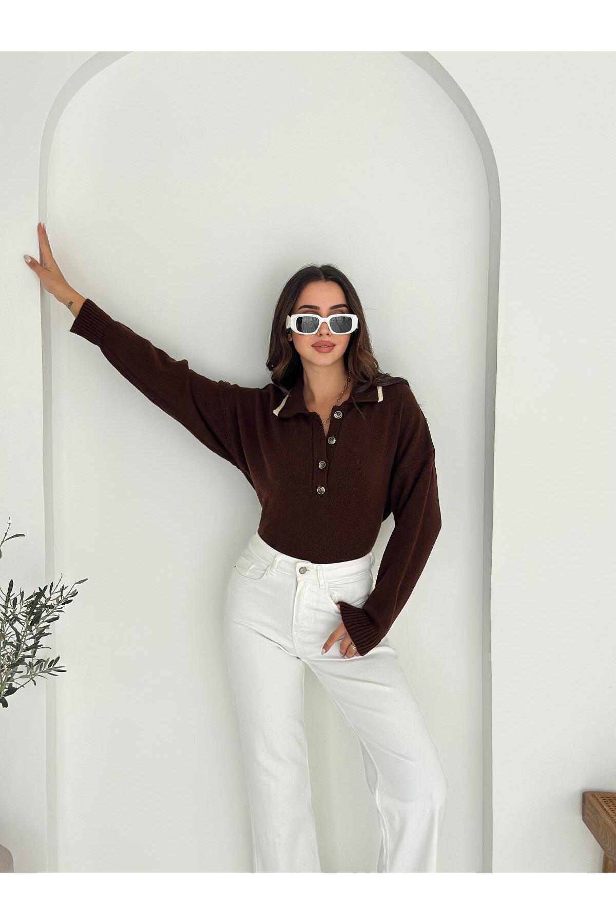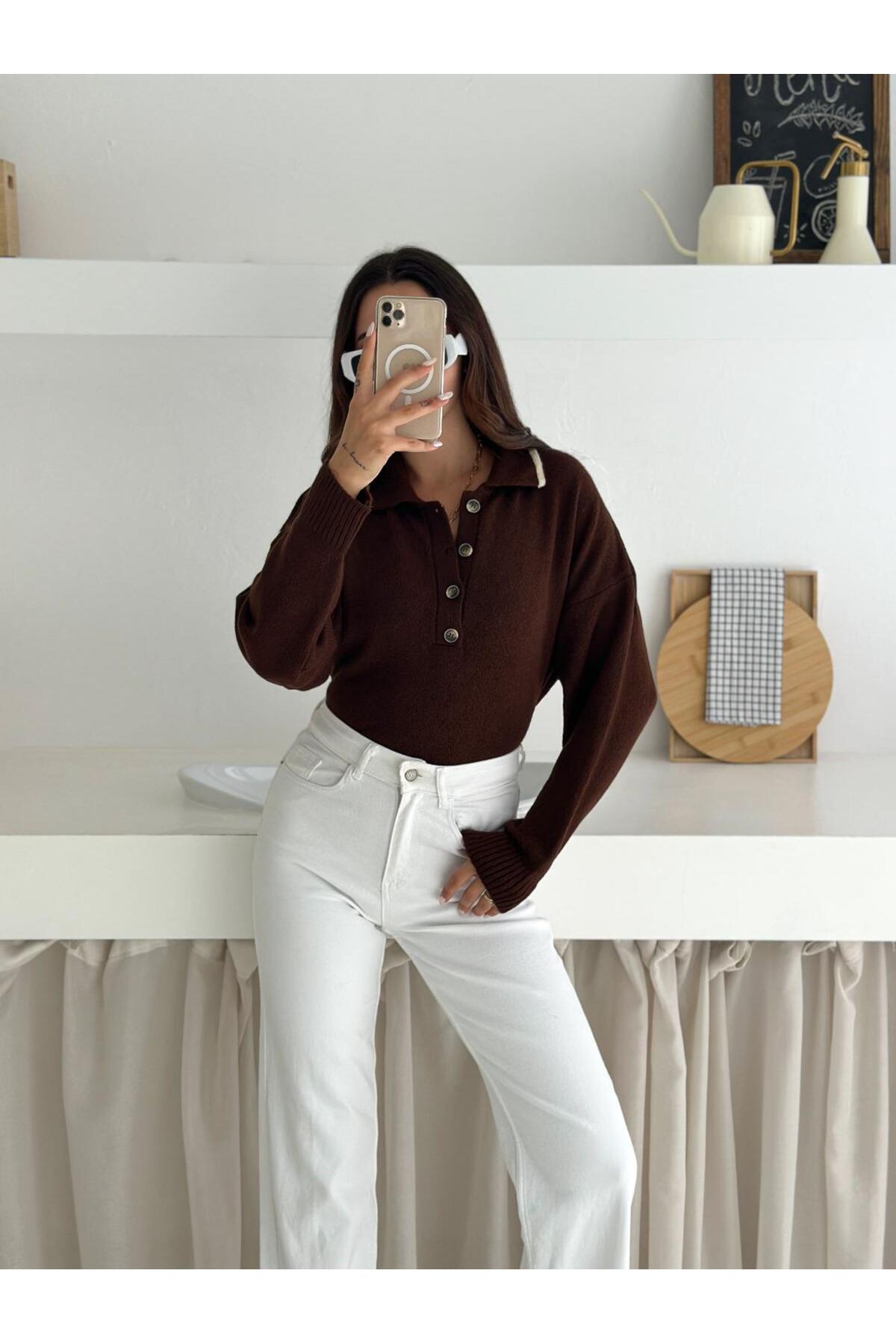 Polo Yaka Düğmeli Yumuşak Dokulu Triko Kazak