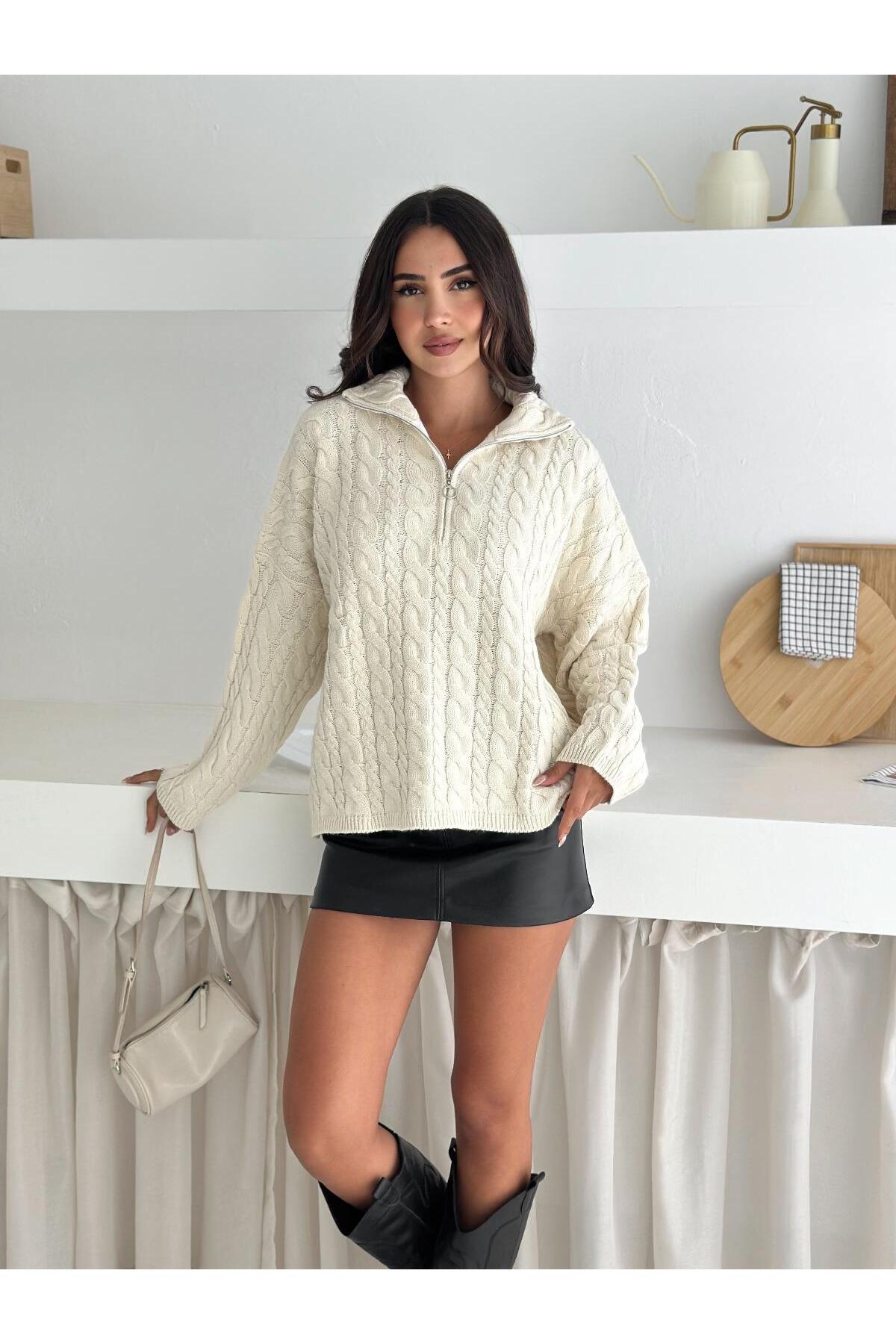 Saç Örgü Desenli Yarım Fermuarlı Dik Yaka Triko Kazak