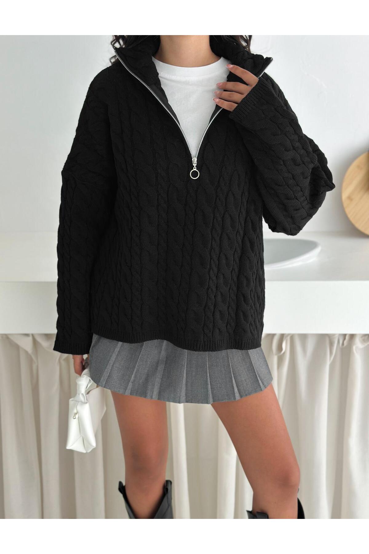 Saç Örgü Desenli Yarım Fermuarlı Dik Yaka Triko Kazak
