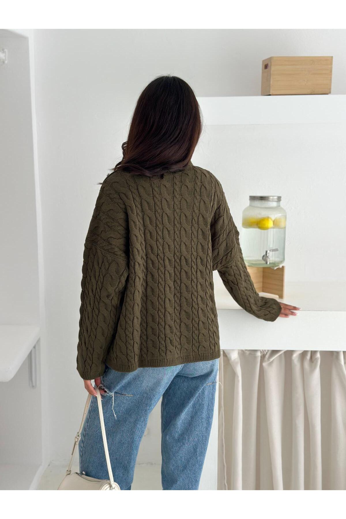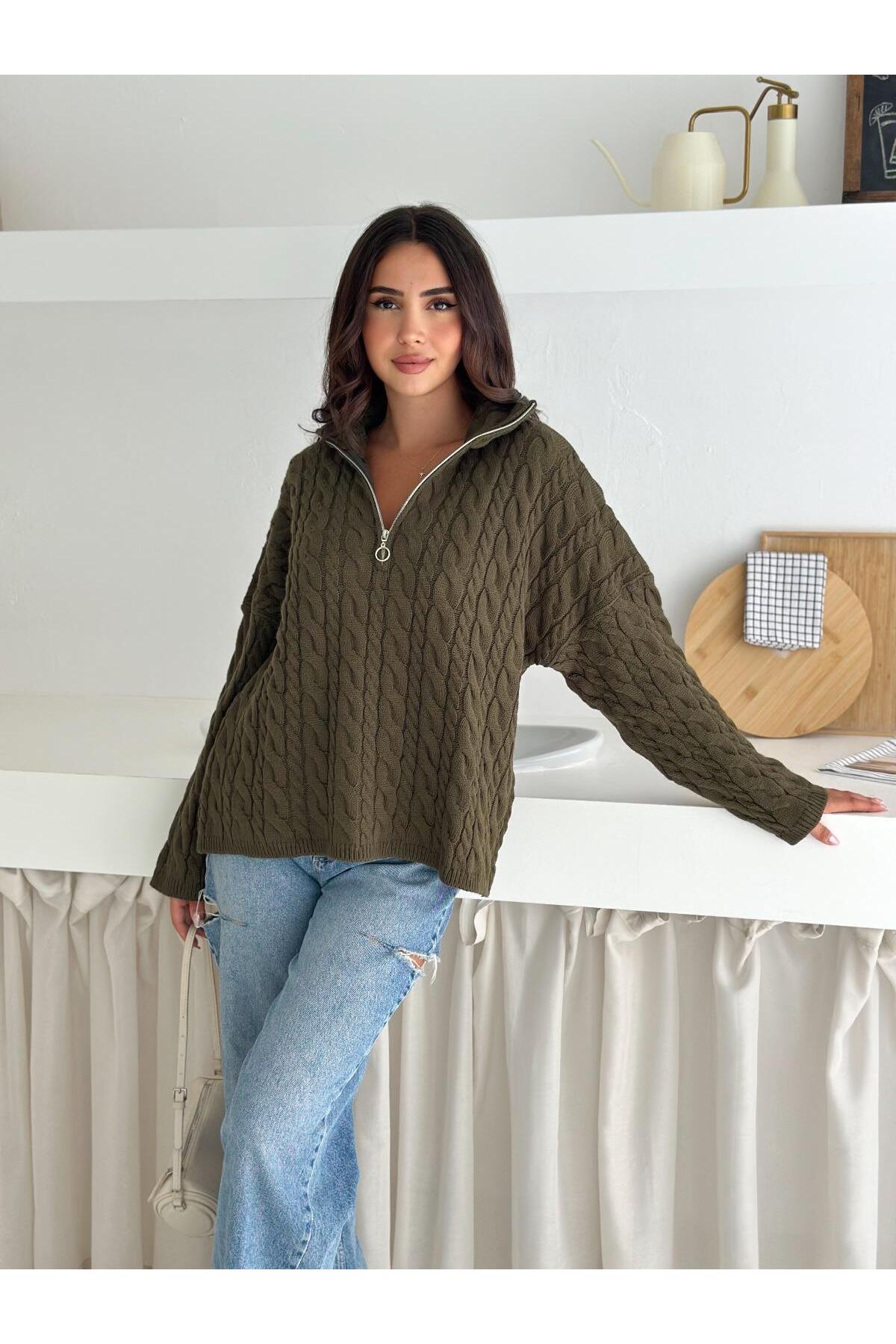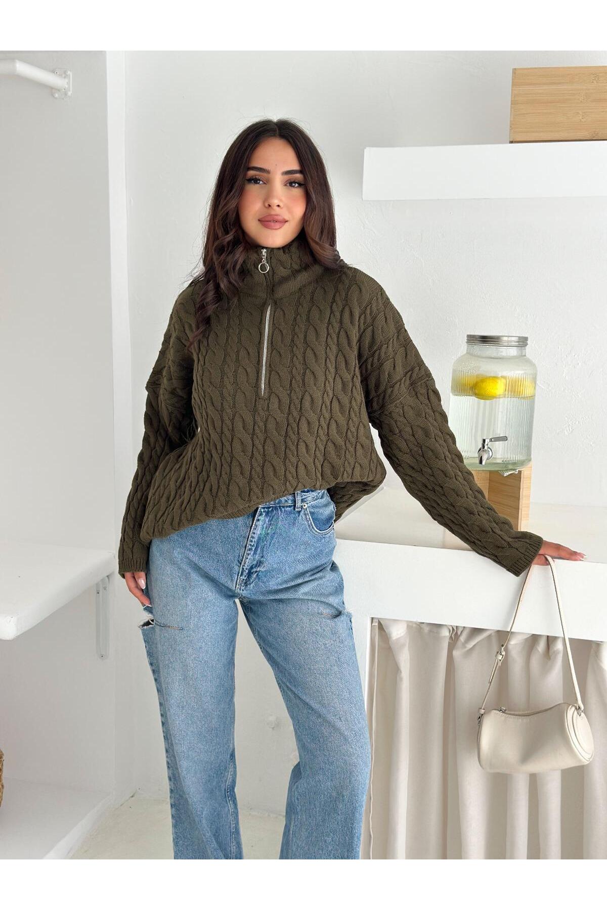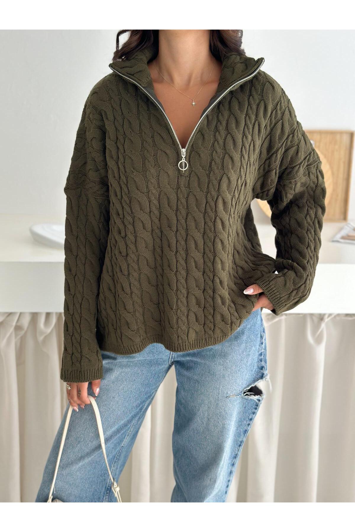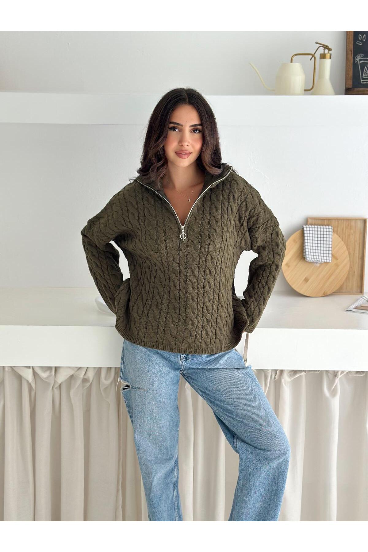 Saç Örgü Desenli Yarım Fermuarlı Dik Yaka Triko Kazak