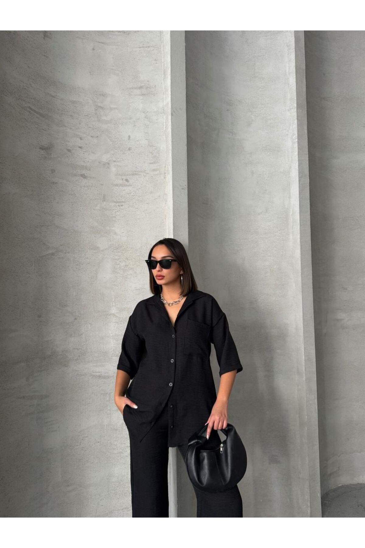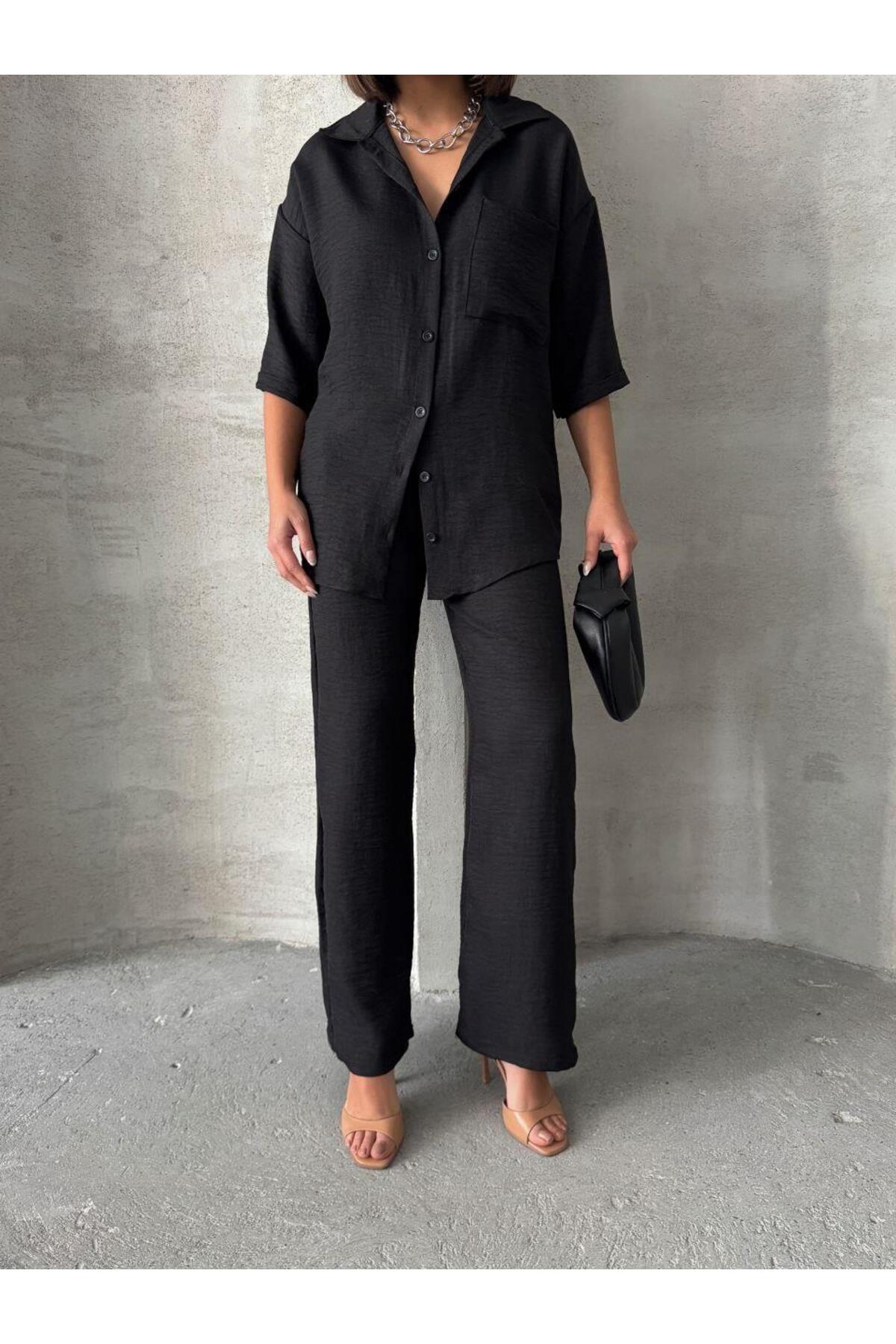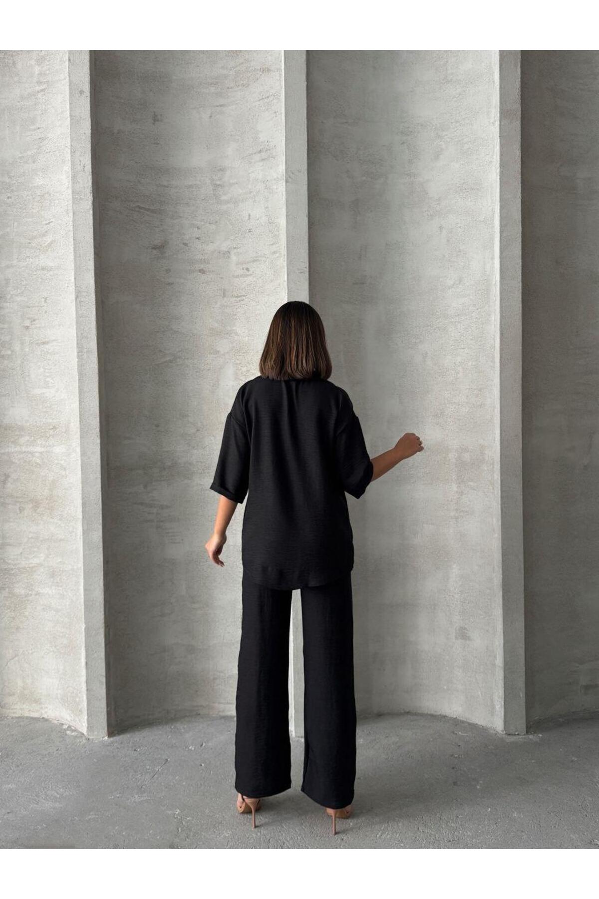 Siyah Keten Dokulu Oversize Gömlek ve Palazzo Pantolon Takım