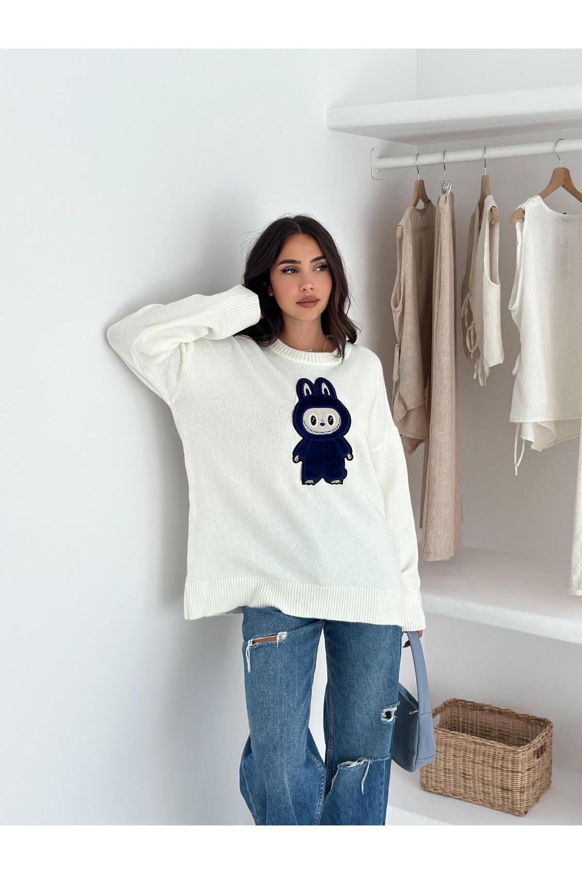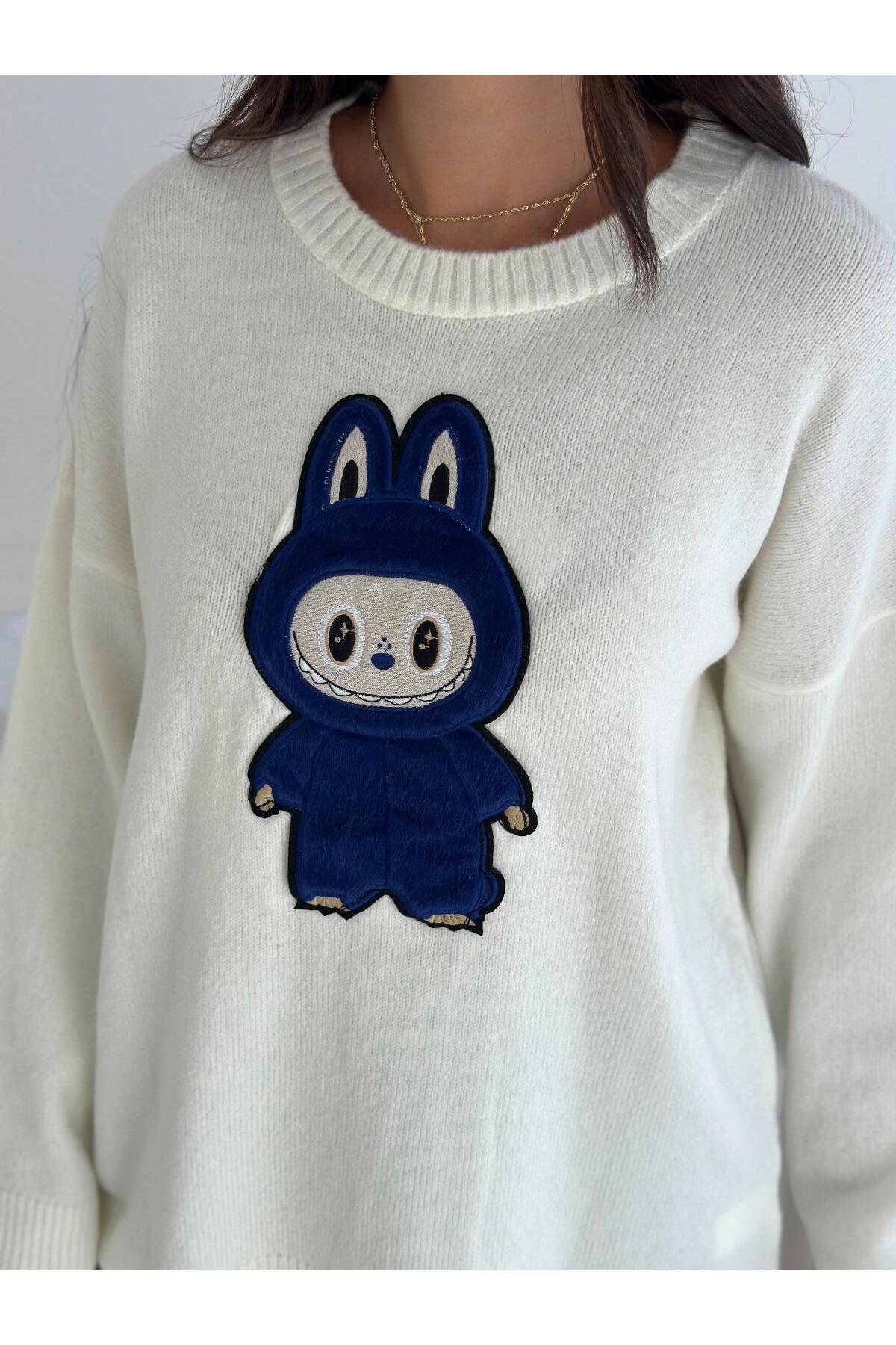 Tavşan Figürlü Oversize Bisiklet Yaka Triko Kazak