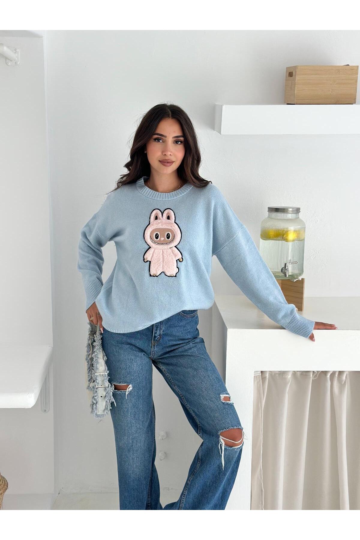 Tavşan Figürlü Oversize Bisiklet Yaka Triko Kazak
