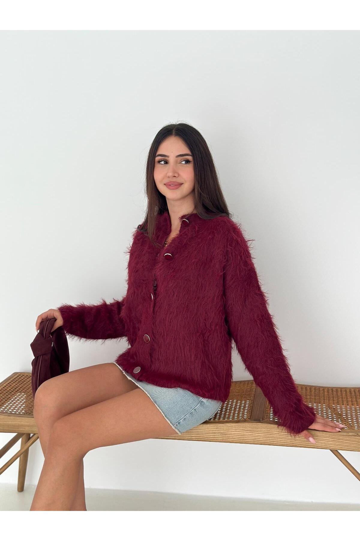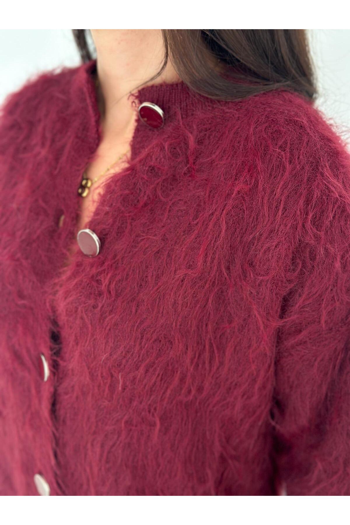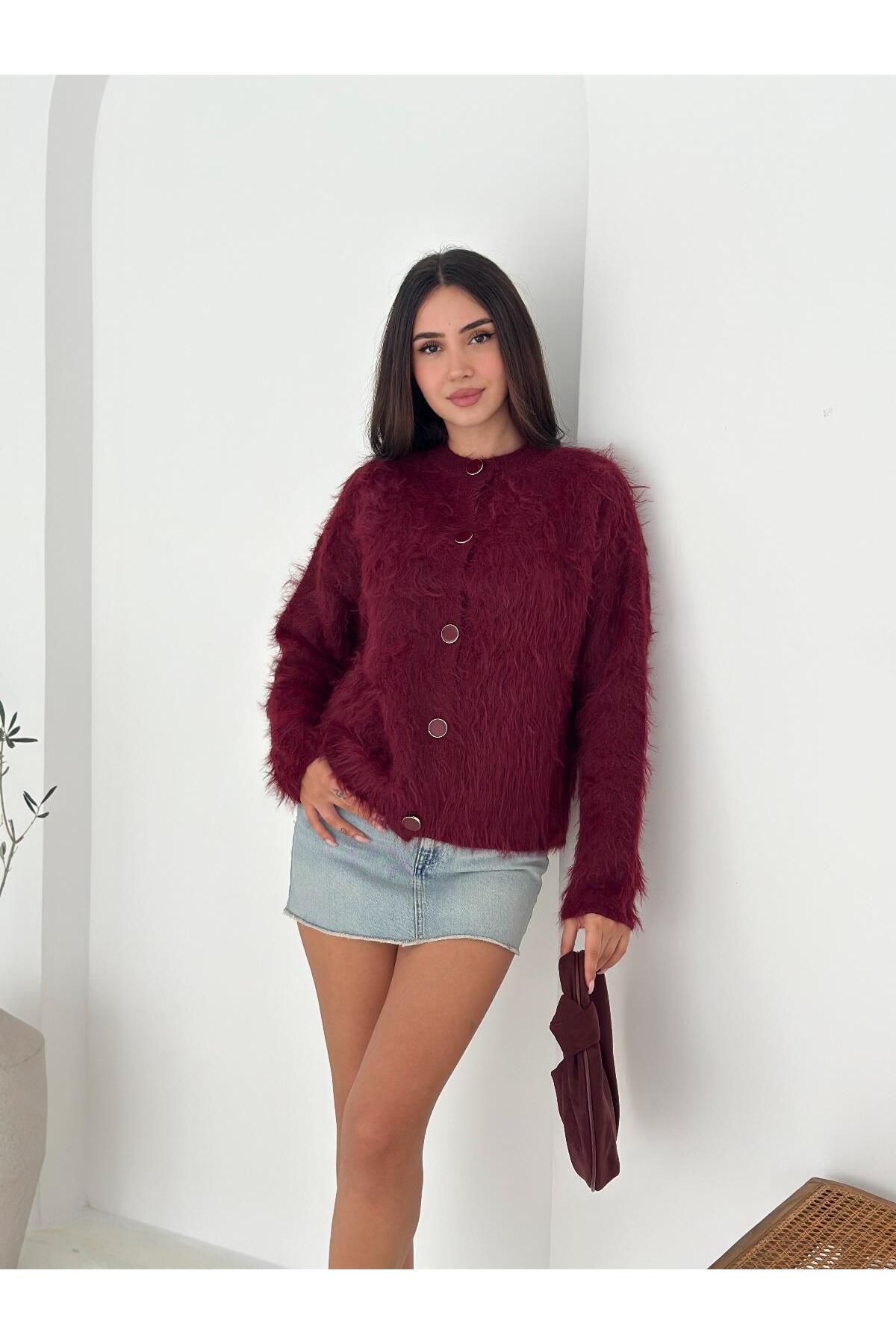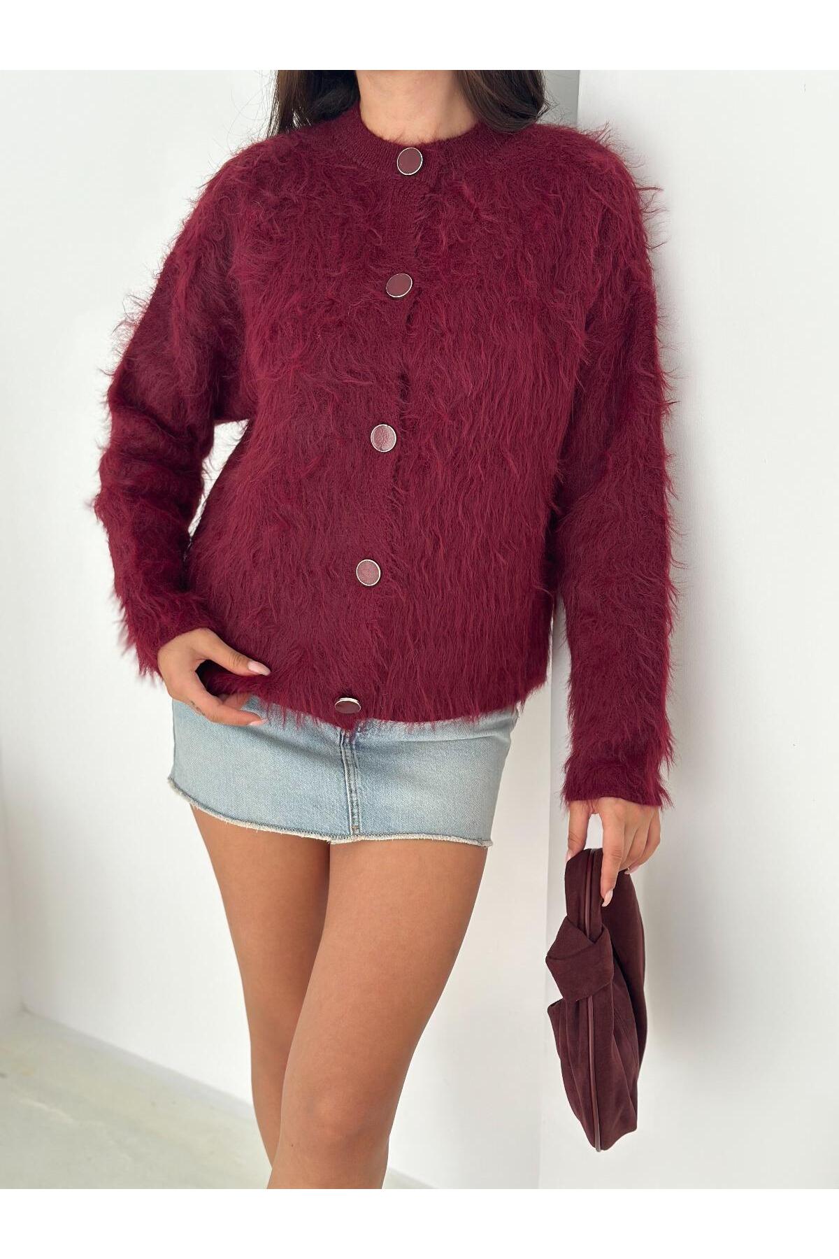 Tüylü Dokulu Bisiklet Yaka Büyük Düğmeli Triko Hırka