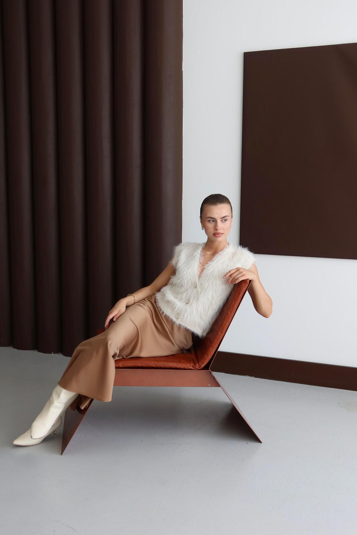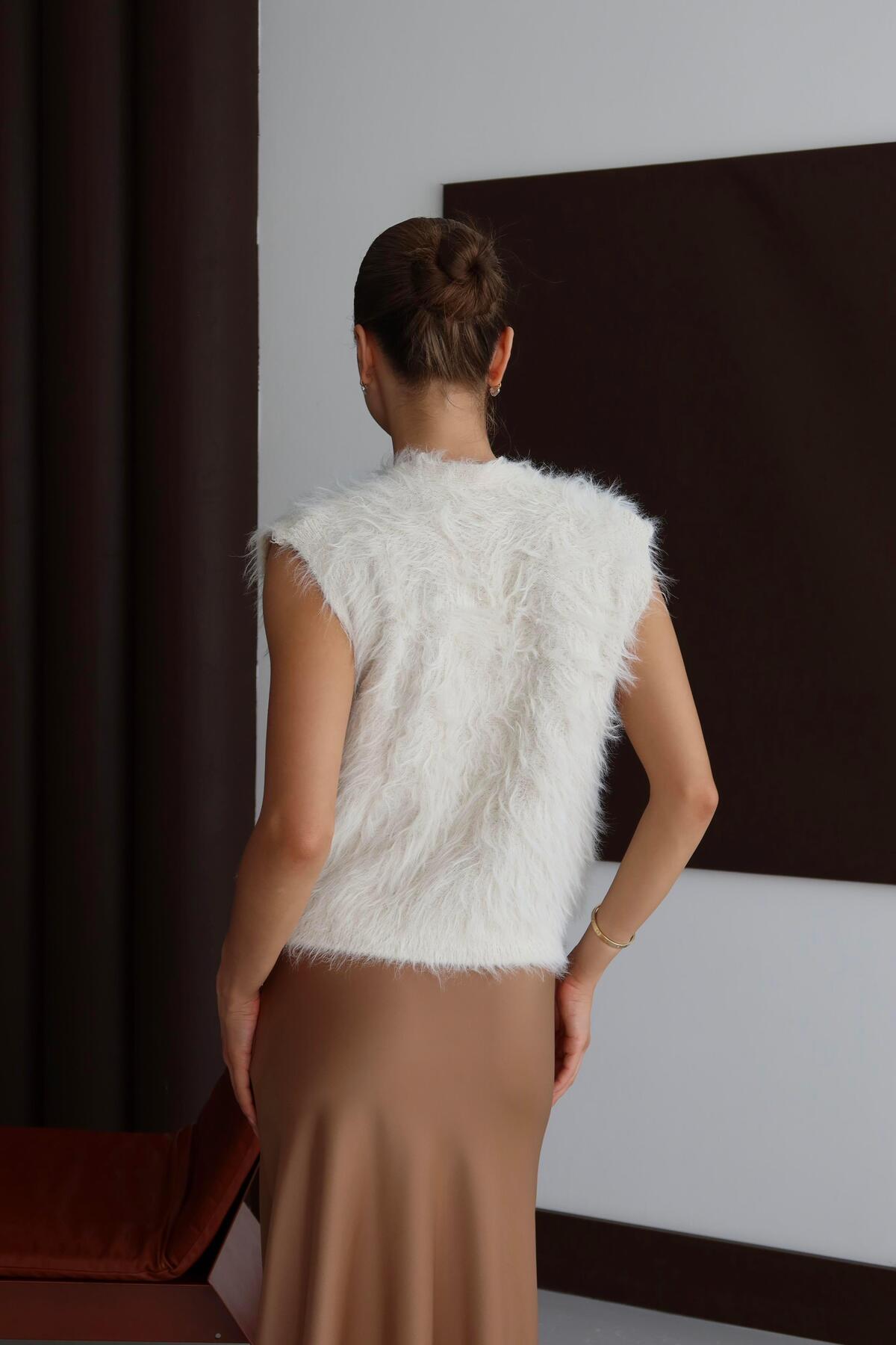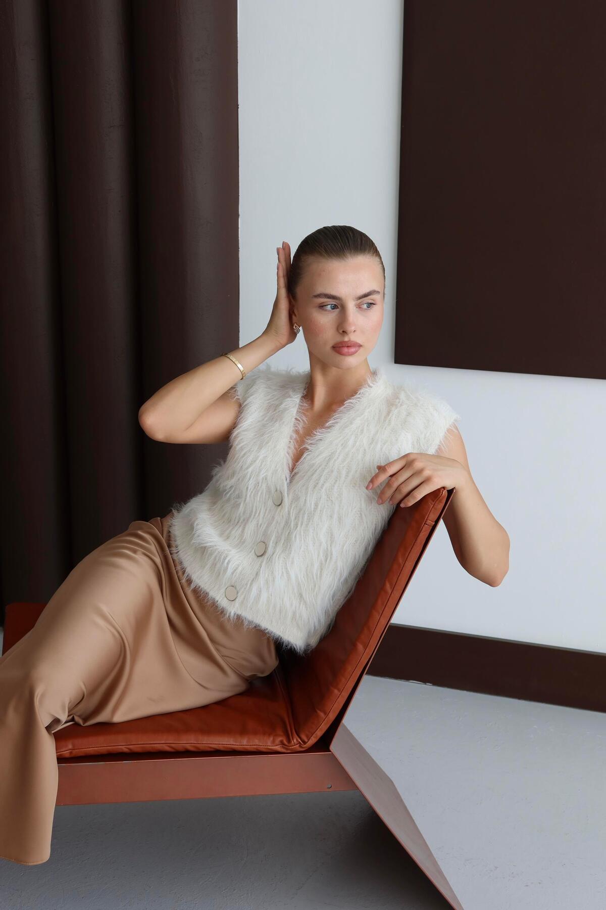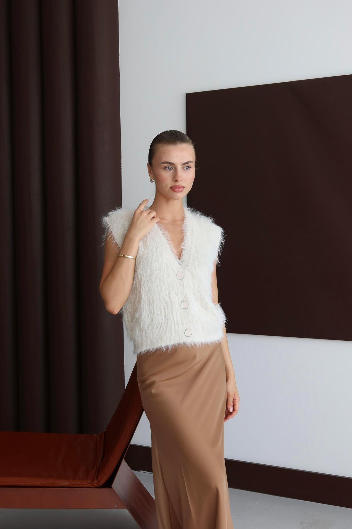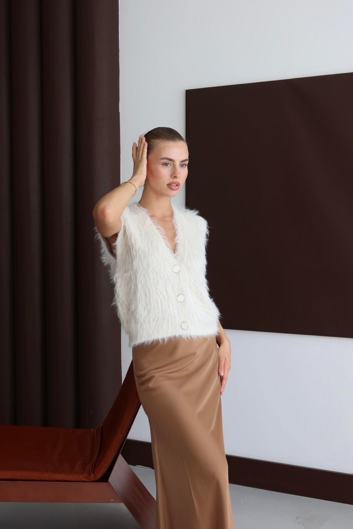 V Yaka Düğmeli Tüylü Triko Yelek, sezonun trend parçaları arasında yer alıyor. Yumuşacık triko dokusu ve modern tasarımıyla hem günlük hem şık kombinlerde rahatlıkla kullanılabilir.