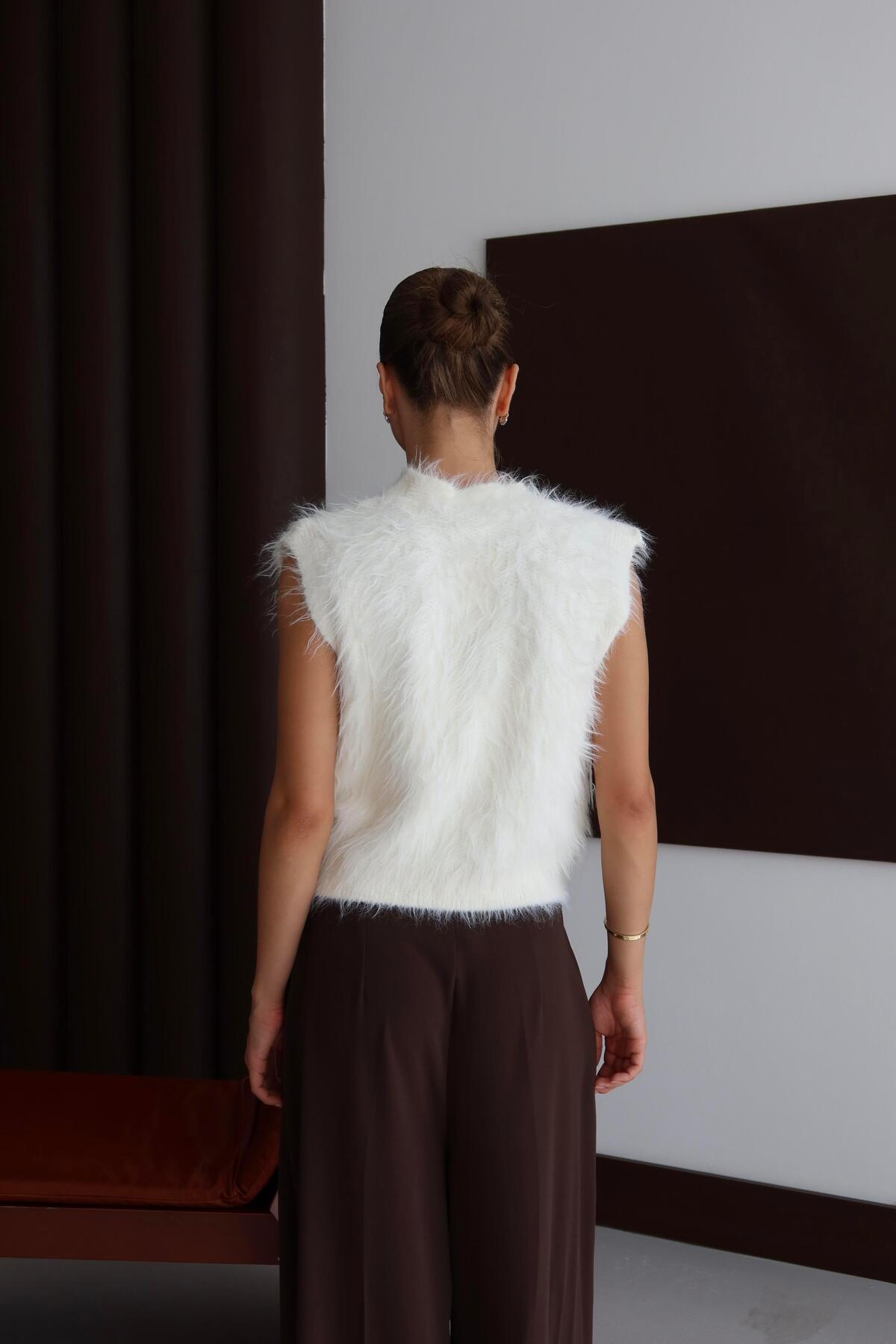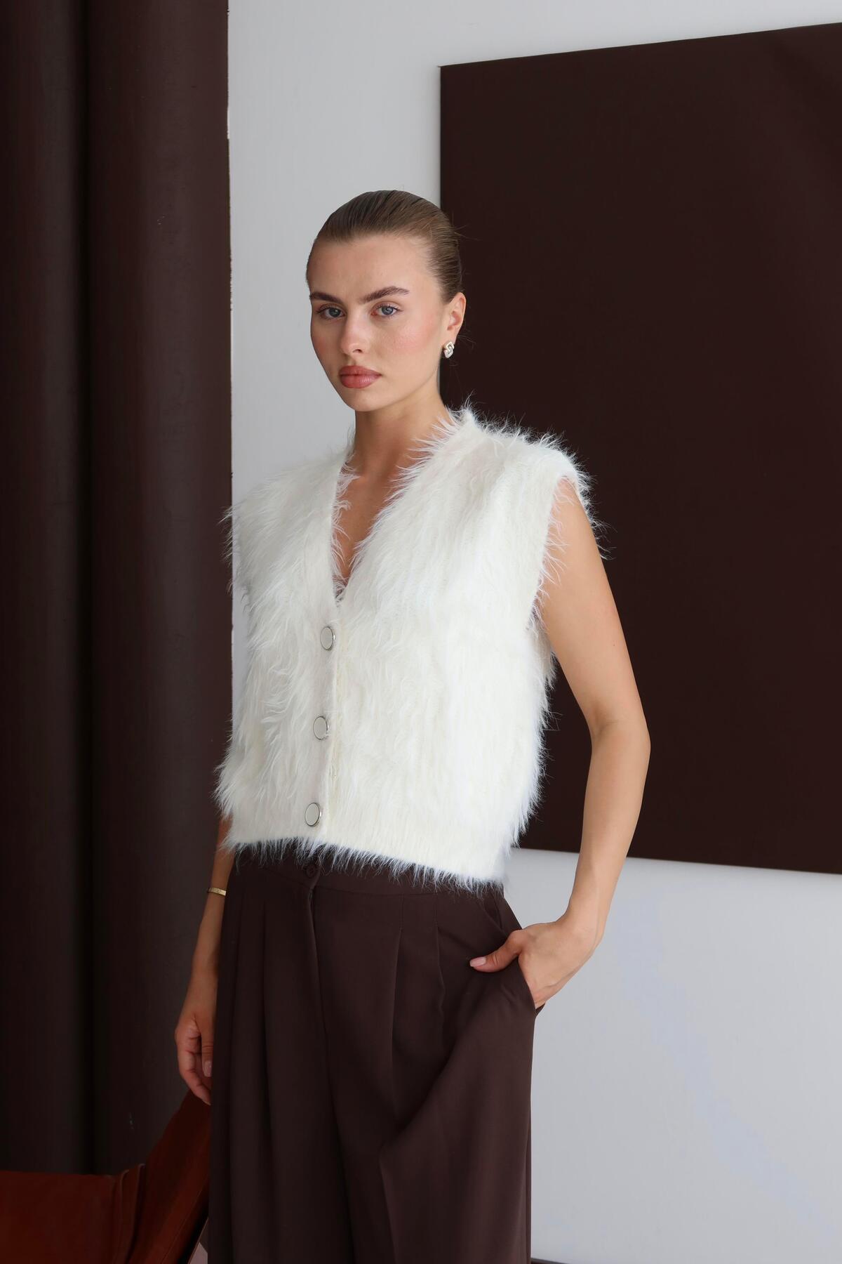 V Yaka Düğmeli Tüylü Triko Yelek, sezonun trend parçaları arasında yer alıyor. Yumuşacık triko dokusu ve modern tasarımıyla hem günlük hem şık kombinlerde rahatlıkla kullanılabilir.