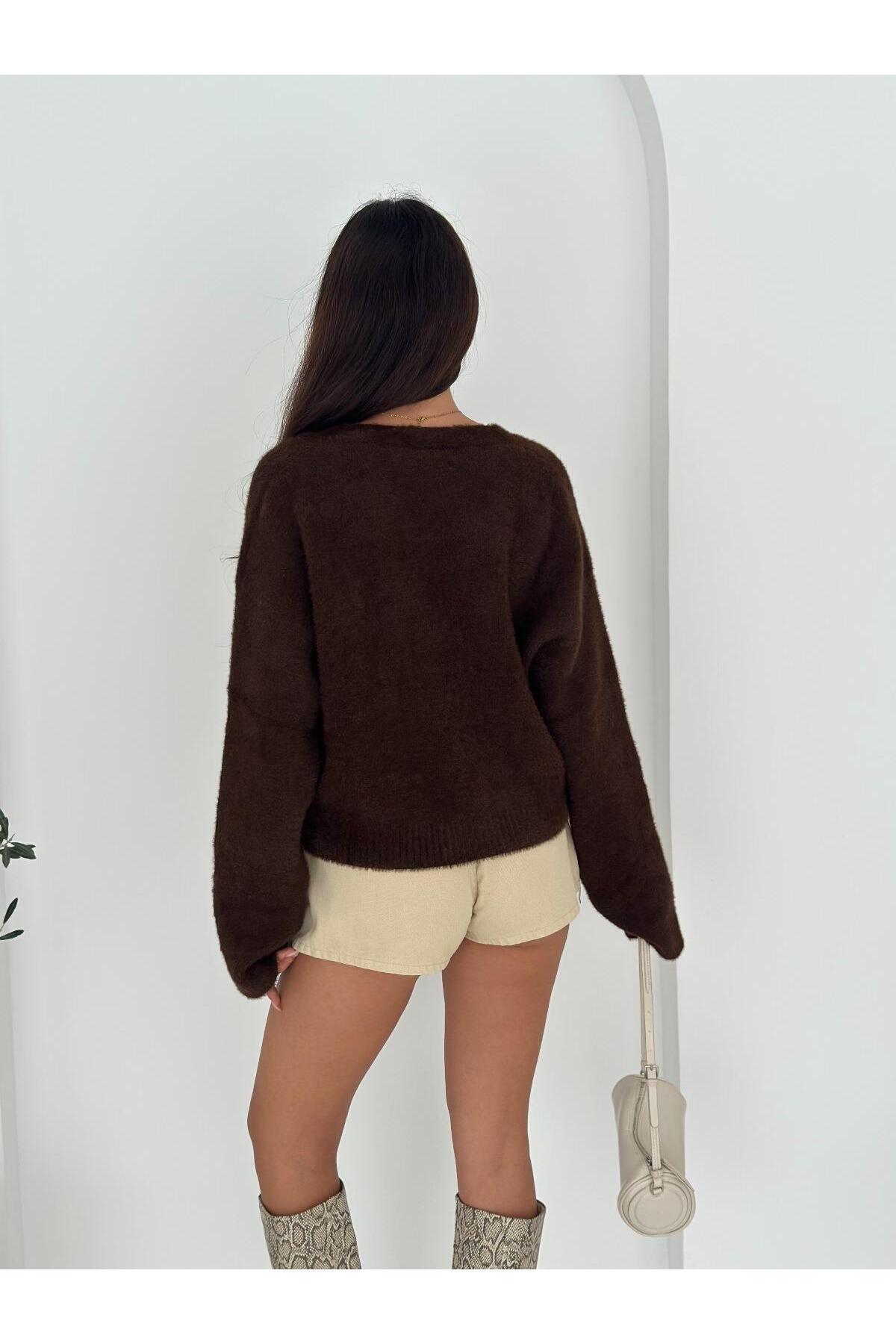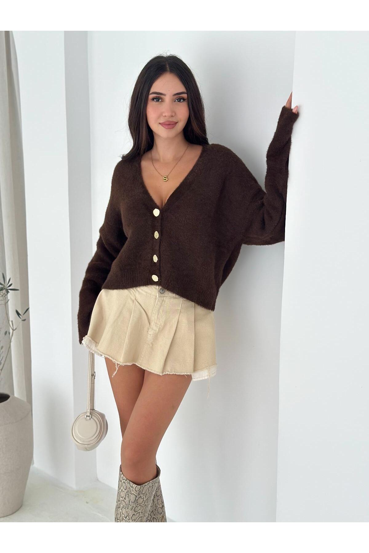 V yaka, altın ton düğmeli ve ekstra yumuşak tüylü dokusuyla sıcak ve şık triko hırka.; Rahat kalıp, günlük kombinlere hemen uyum sağlar.